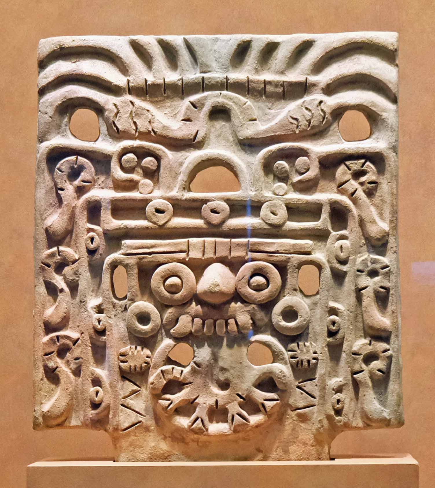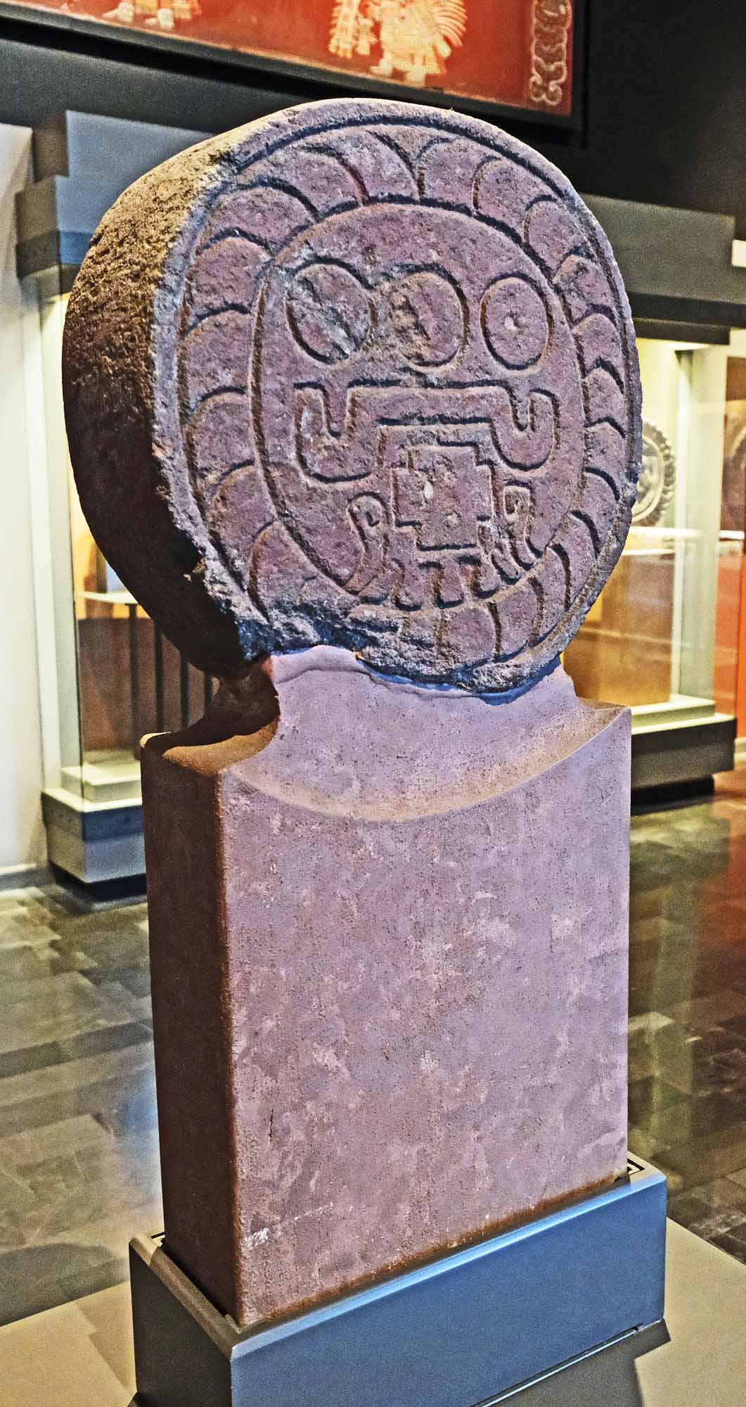 〔シパクトリ〕はワニに似ていると言われています。顔面下部の2本の牙の上の、横長の装飾品は鼻飾りで、その奥に、両目があります。その上部に、両目の間に、平な〔太い円〕が2つ並んでいます。これが、第二代の〔トラロック神〕の象徴です。