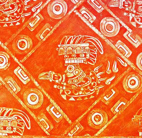 ↑〔アテテルコ〕壁画(西暦350年以降)。黒曜石のナイフを手に、戦士が舟に乗っている。