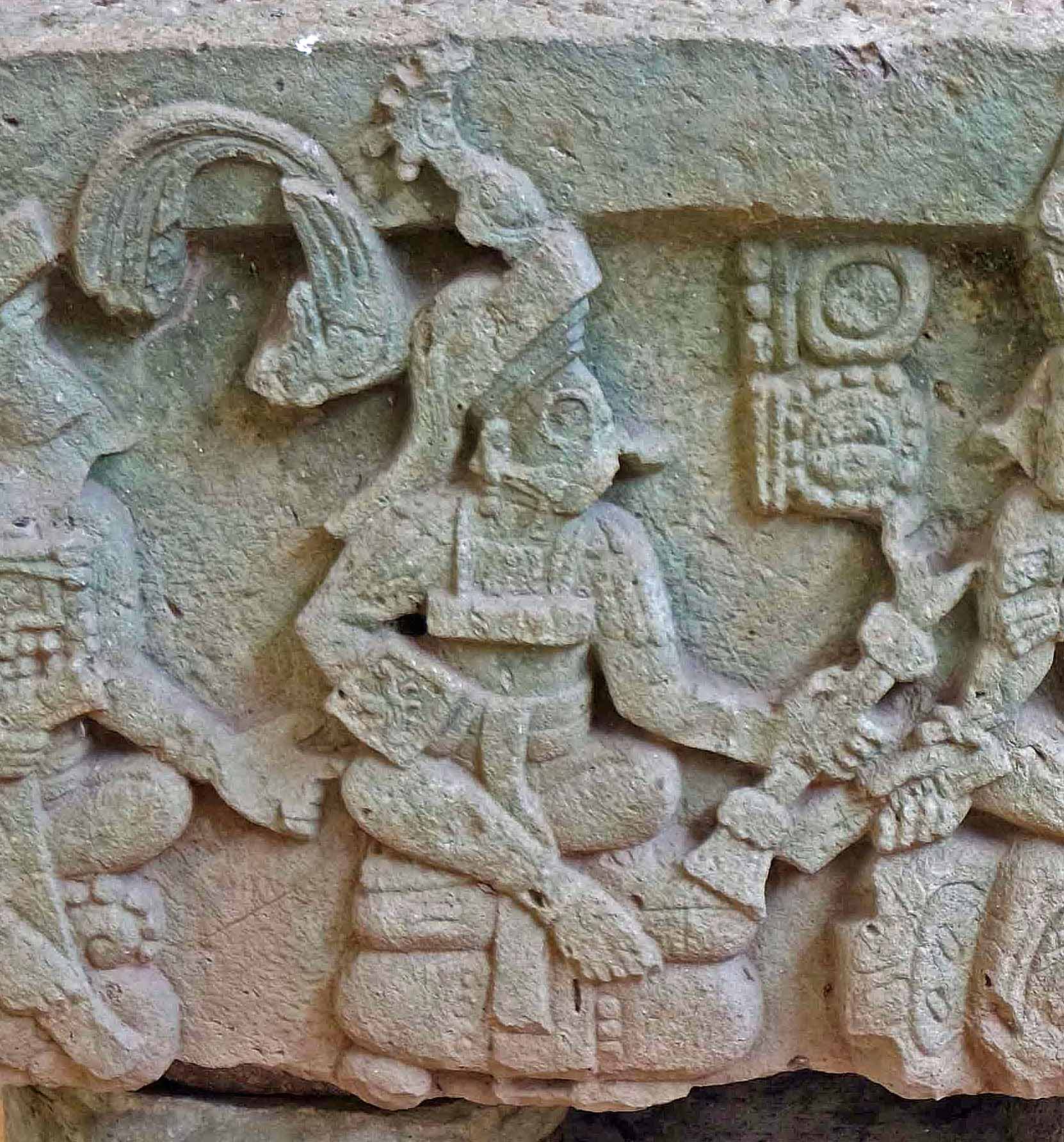 祭壇Qは、西暦776年に建立され、初代王が刻まれています。彼は、テオティワカンによく見られる羽根飾りとゴーグルを身につけています。