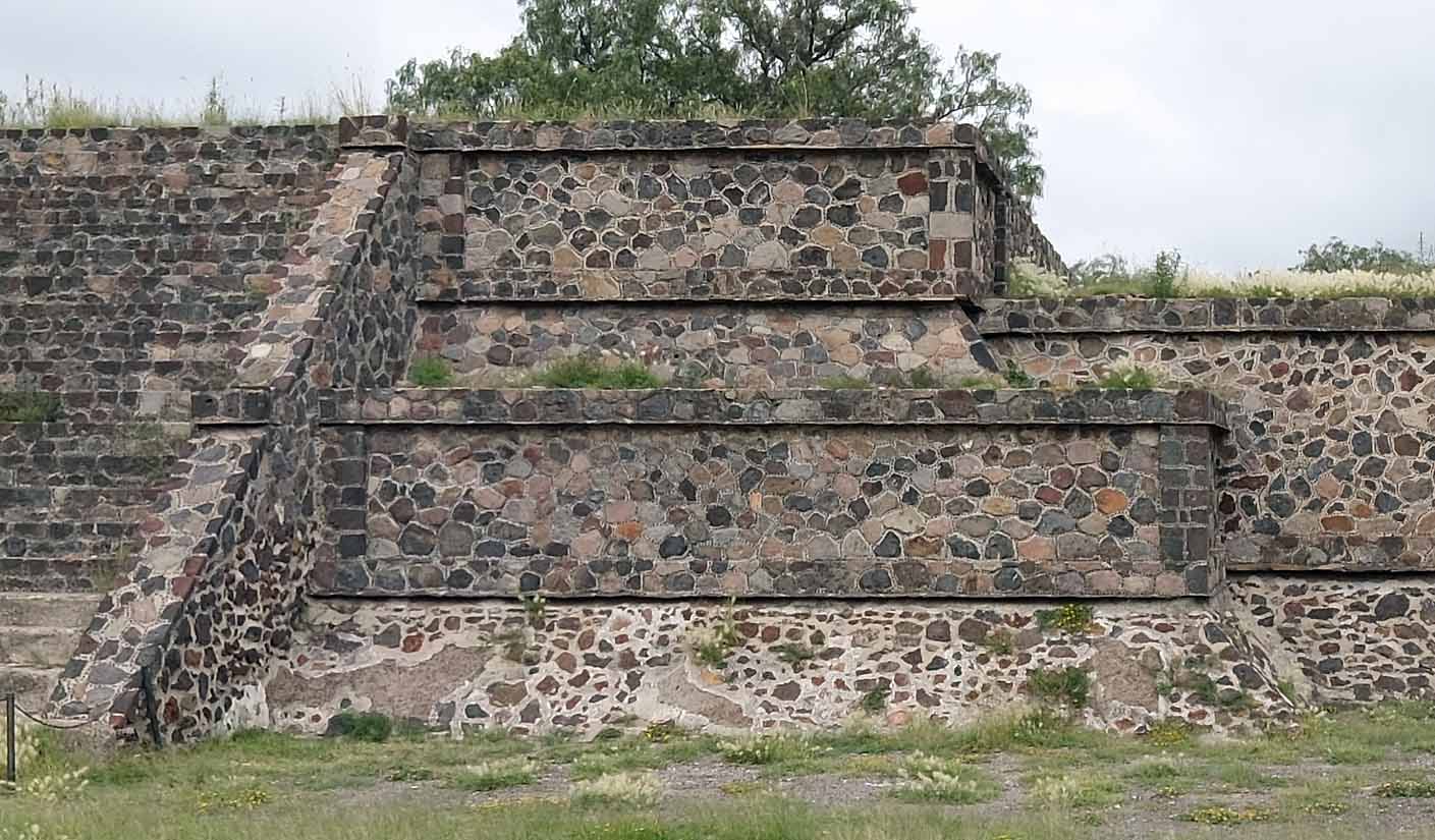 また、いくつかの論文は、テオティワカンの通りは建築軸からわずかに逸れてはまた建築軸に戻り、少なくない数の建物の外壁が通りへせり出していると観察しています。その程度は箇所により様々ですが、化学繊維的ではなく、綿で編まれた布の風合い、を醸し出している可能性があります。もしかしたら、観光客も考古学者も、〔太陽のピラミッド〕のなだらかに上昇するラインや、実際の建築物の、都市建築軸からの微かなずれに柔らかい感触を感じているのかもしれません。