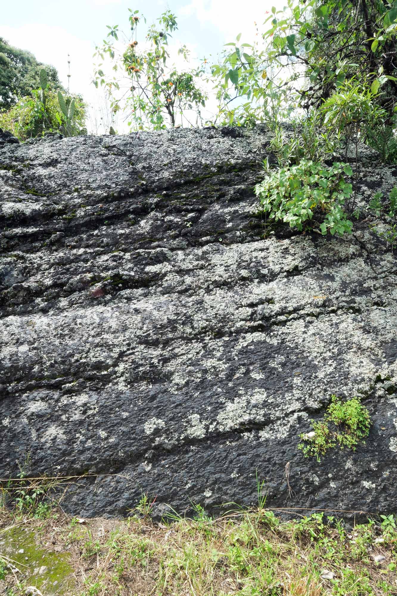観光客は、円形ピラミッドの東側の、建築物Elという小さな祭壇まで歩いていけます。そこへの小道の途中、人工的に切り通した溶岩の厚さが見てとれます。とても人力では除去できそうにありません。