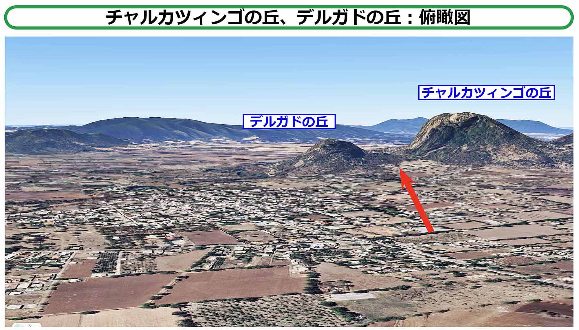 〔ショチトル神殿〕は、都市の北の〔ゴルド山〕にあります。その衛星写真を見てみましょう。
