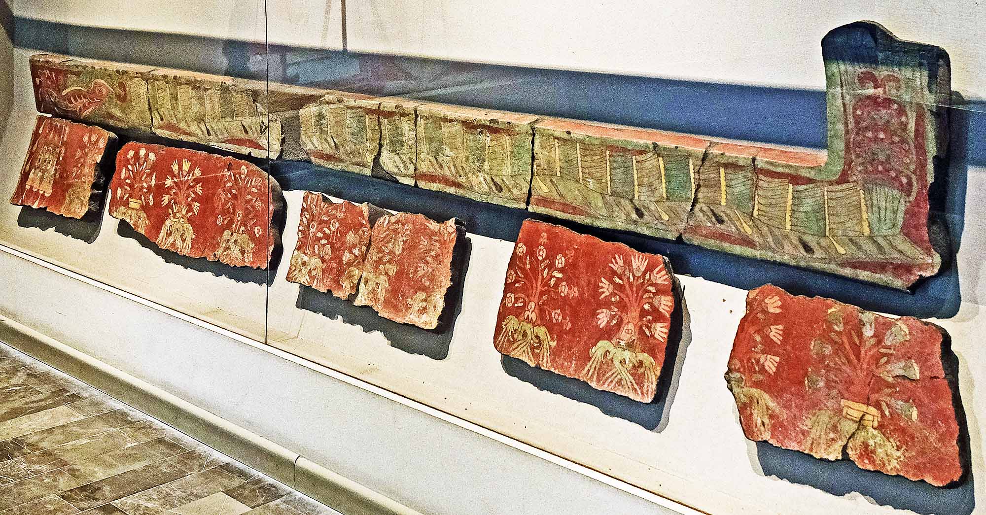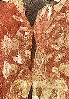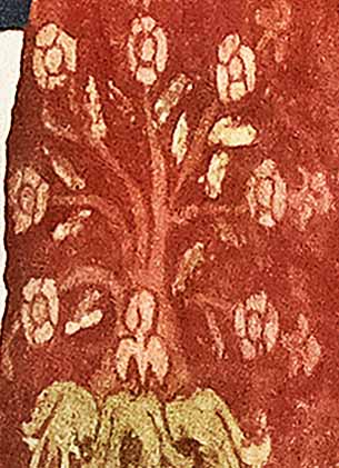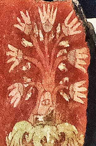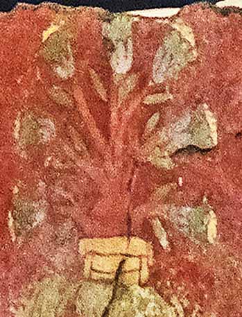 考古学者は、他に3つのほぼ同様の図像があったはずだと提案しています。上の写真の下部には、8本の樹木が残存しています。根の表現はほとんど同じですが、花、及び幹の根本の絵が全て異なります。