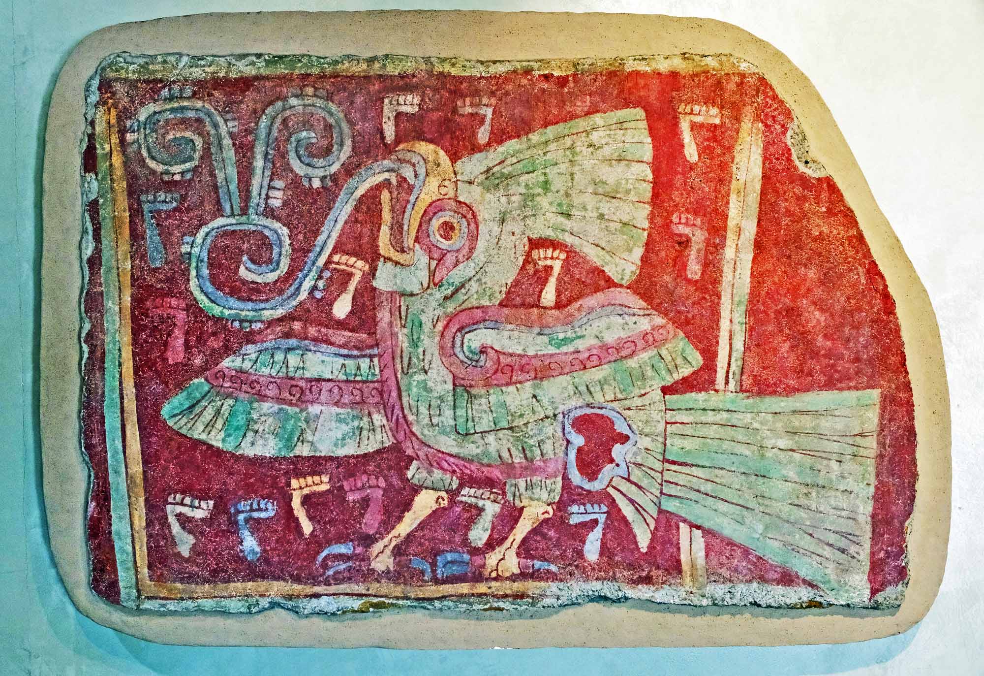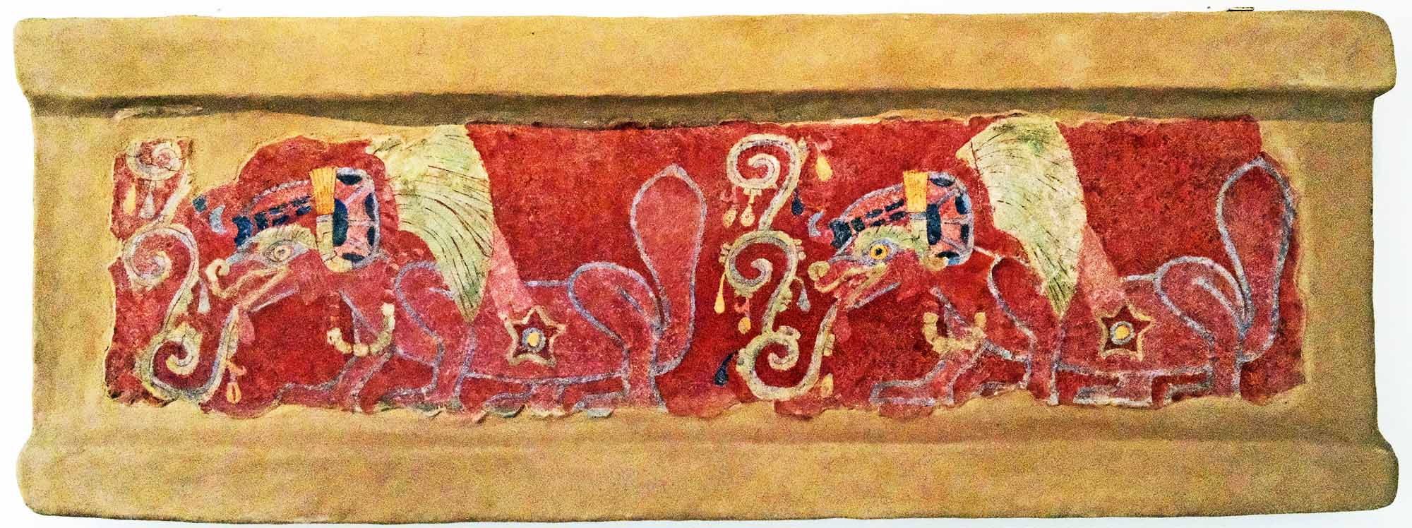 タルー部分に樹木が描かれ、タブレロの枠に〔羽毛の蛇〕がいます。〔羽毛の蛇〕は口からもたらす水が、樹木を潤す、という構図でしょうか。