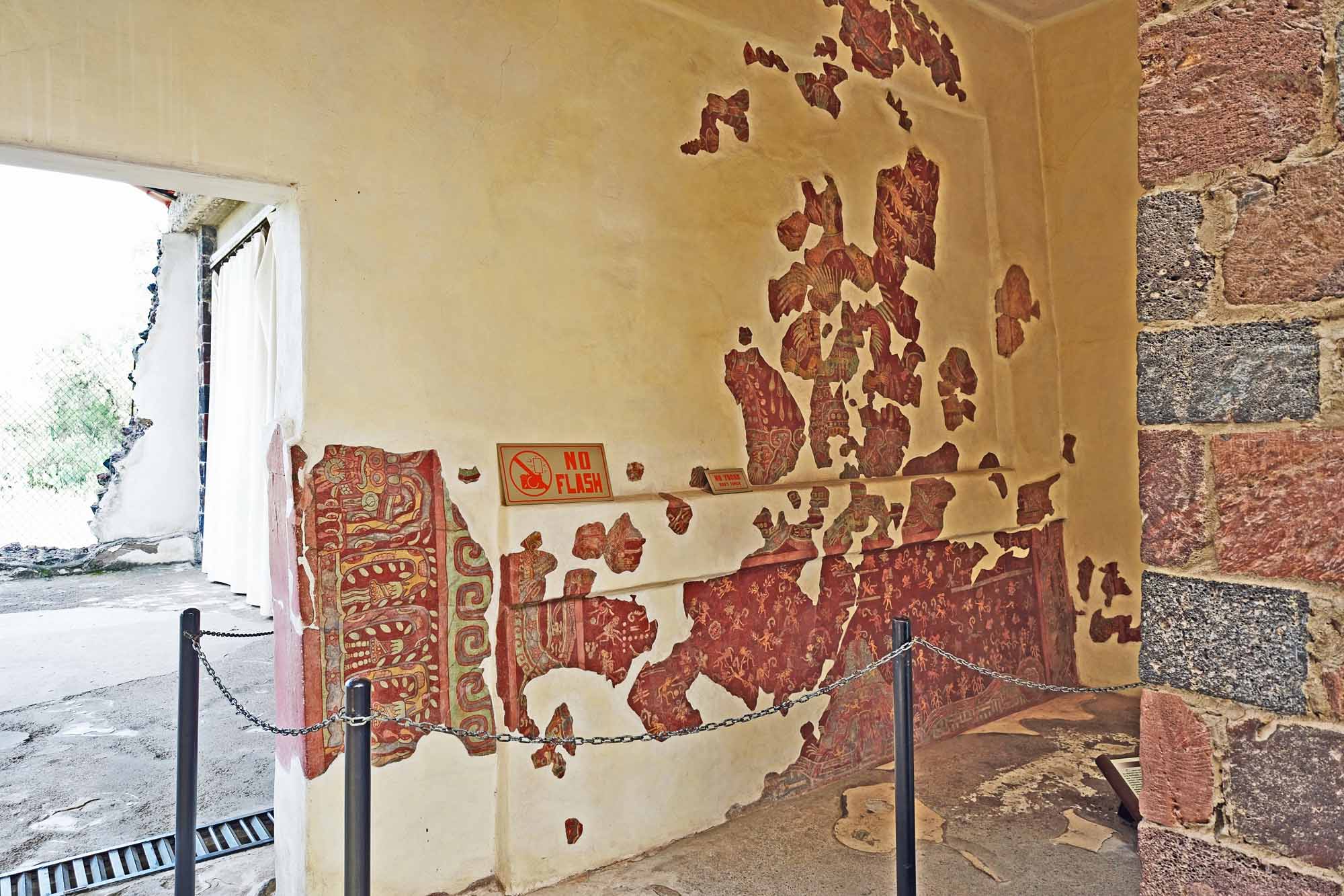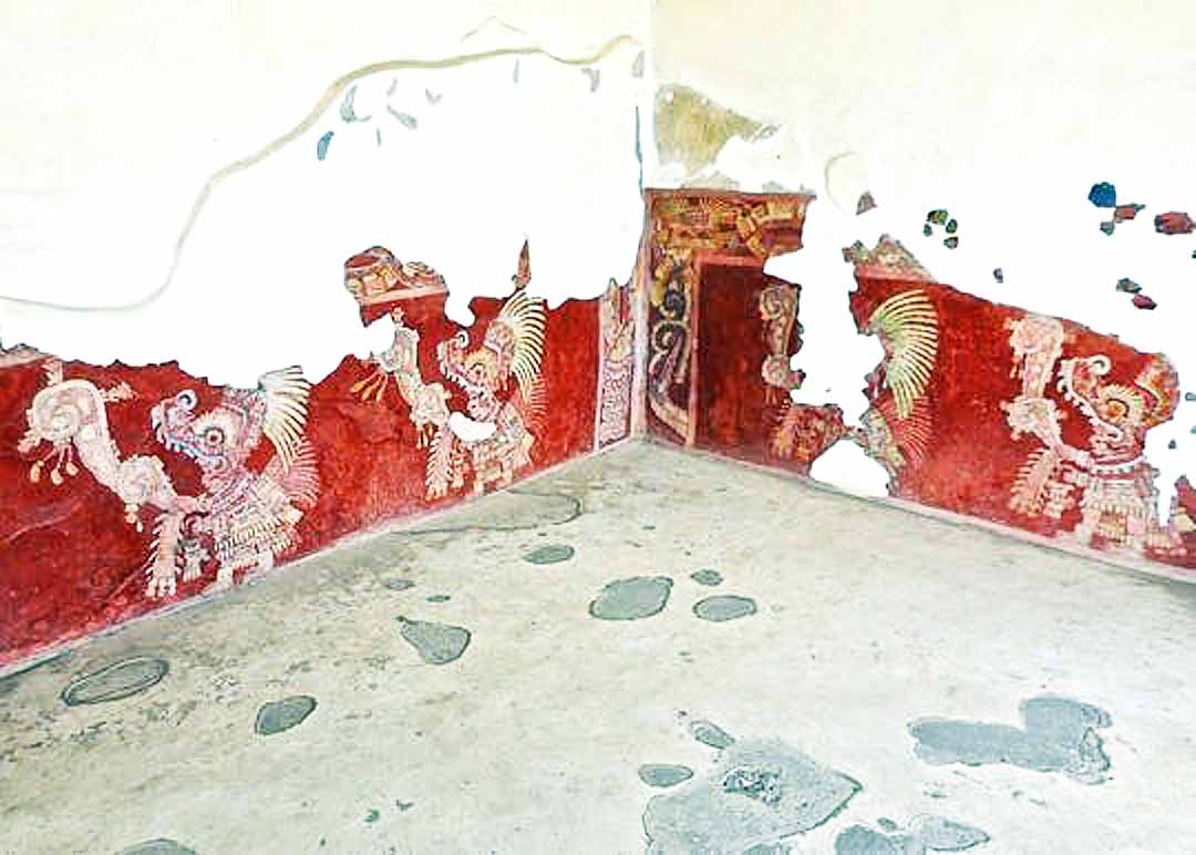 壁画はほとんど剥落して、クリーム色に塗られてあります。残っている部分を見ると、中庭2のそれと同じようです。門口の向こうの壁に、〔トラロックの樹木〕と〔トラロックの楽園〕の壁画の一部が見えます。