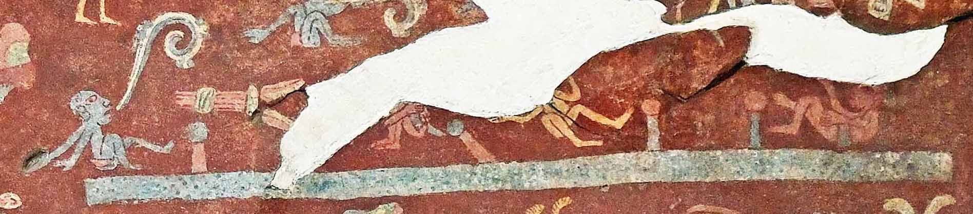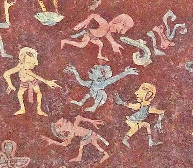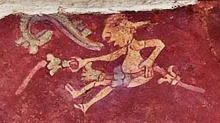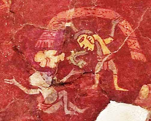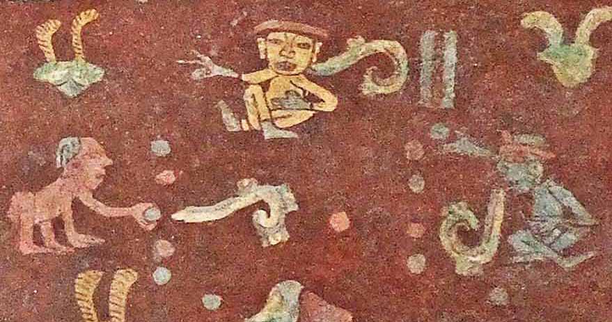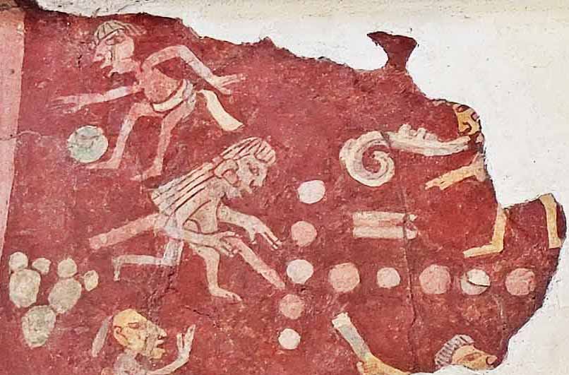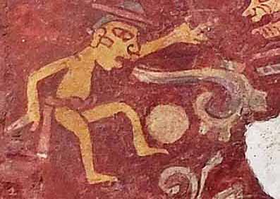 後に触れますが、専用球儀場は西暦100年の〔プレ城砦〕にあったと報告されています。西暦120年以降は、テオティワカンでは新築されていません。〔テパンティトラ〕の壁画は350年以降に描かれているので、球儀専用場はないのですが球儀はどこかで行われていた、とも見て取れます。