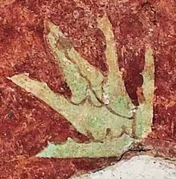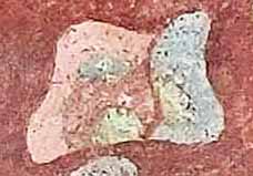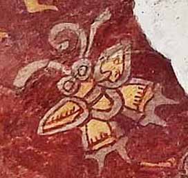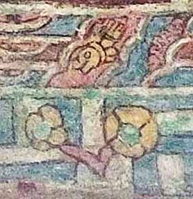中庭の反対側に、〔トラロックの樹木〕と〔トラロックの楽園〕の壁画があります。いや、上の写真の床近くに、またその上の写真の通路2にも、それの部分が残っています。おそらく、通路2と中庭2の全ての壁面は、その壁画の連続で埋まっていたのでしょう。