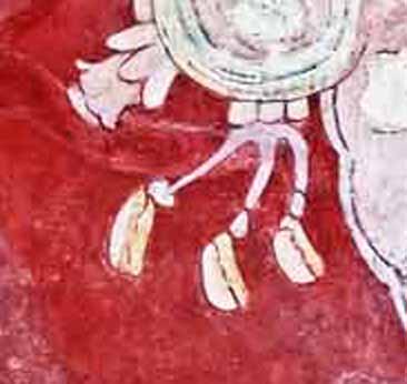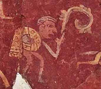 全員ほとんど同じ構図ですが、一人ずつ、異なる点があります。例えば中央の司祭と右の司祭の手からの吹き出しの頂点からぶら下がる植物の描き方が異なります。部屋2の全員が剥落なしで残っていれば、違いが明白に見て取れたはずです。