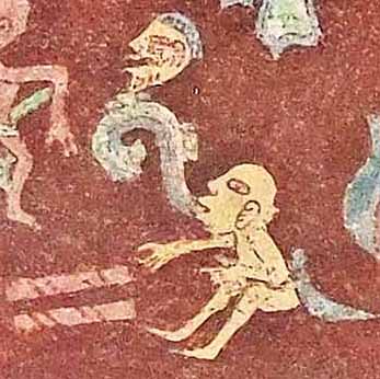 様々な小動物が集ます。司祭が履くサンダルのポンポンはマヤ的です。