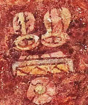 観光看板に私の注釈をつけておきます。正面を向いているので、神です。ちなみに、横顔は司祭/戦士の人間です。〔トラロックの意匠〕、ジャガーの爪、矢の束を持っているので、戦士の神です。