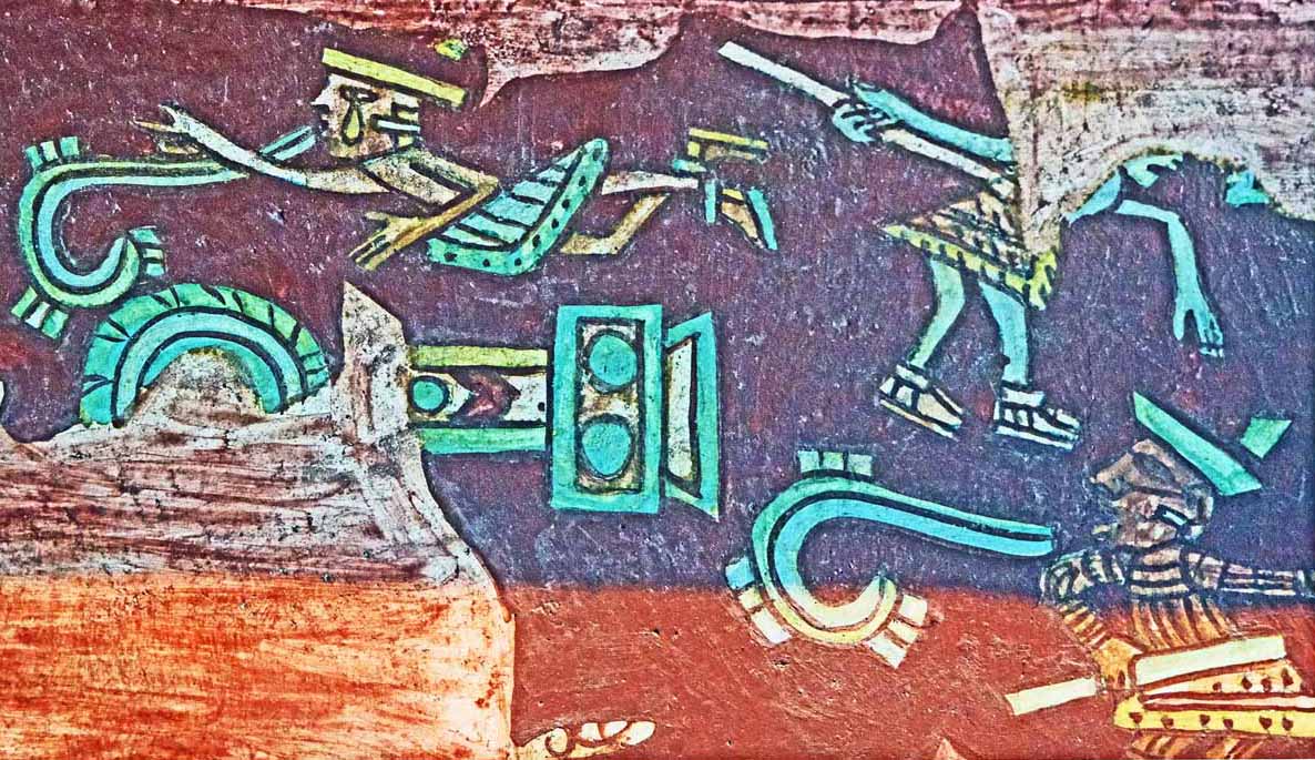 中央に〔トラロック神〕がいて、背面で2本の水路が絡まります。流れに乗っているのは、人間と金星でしょう。
