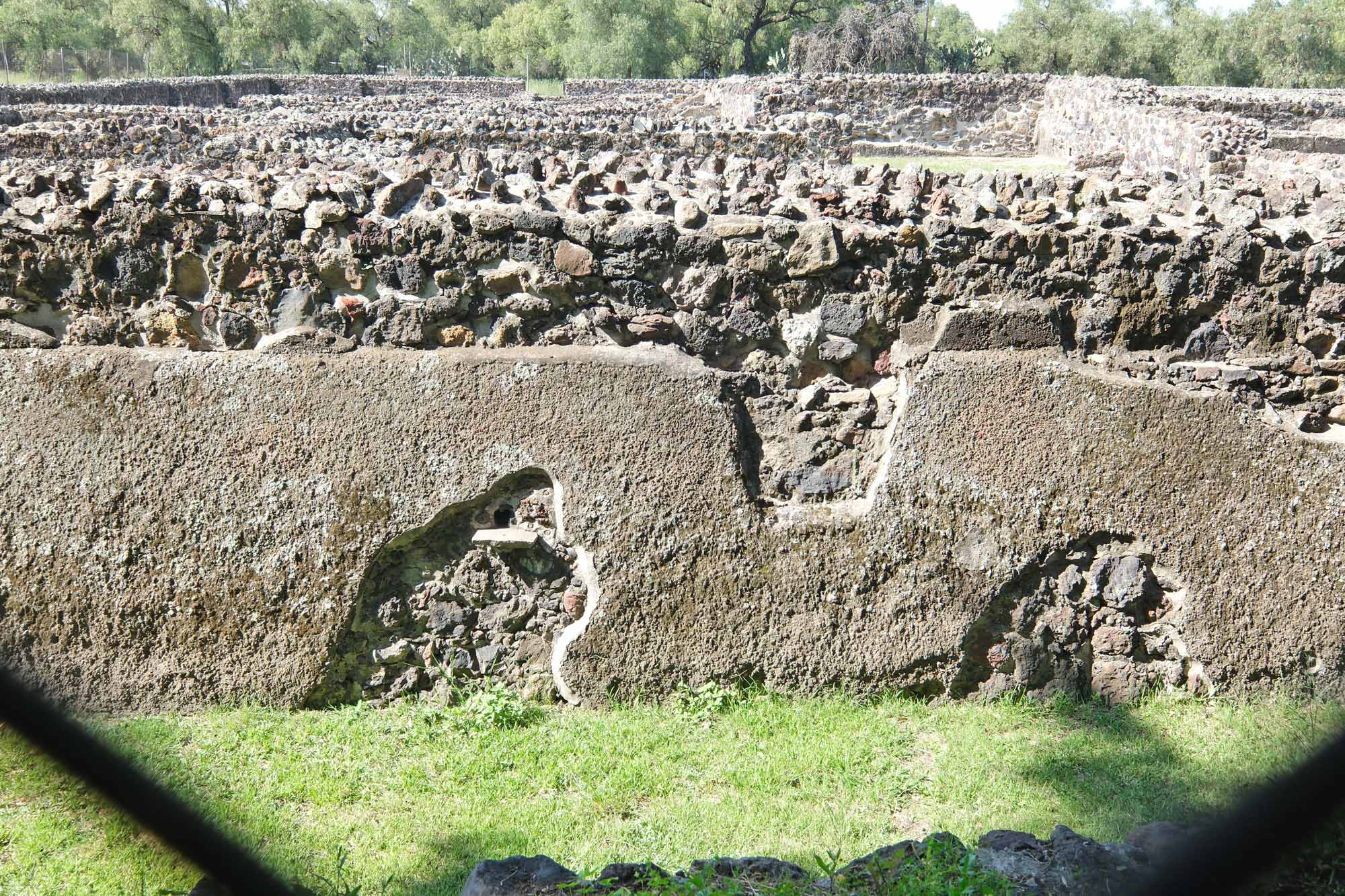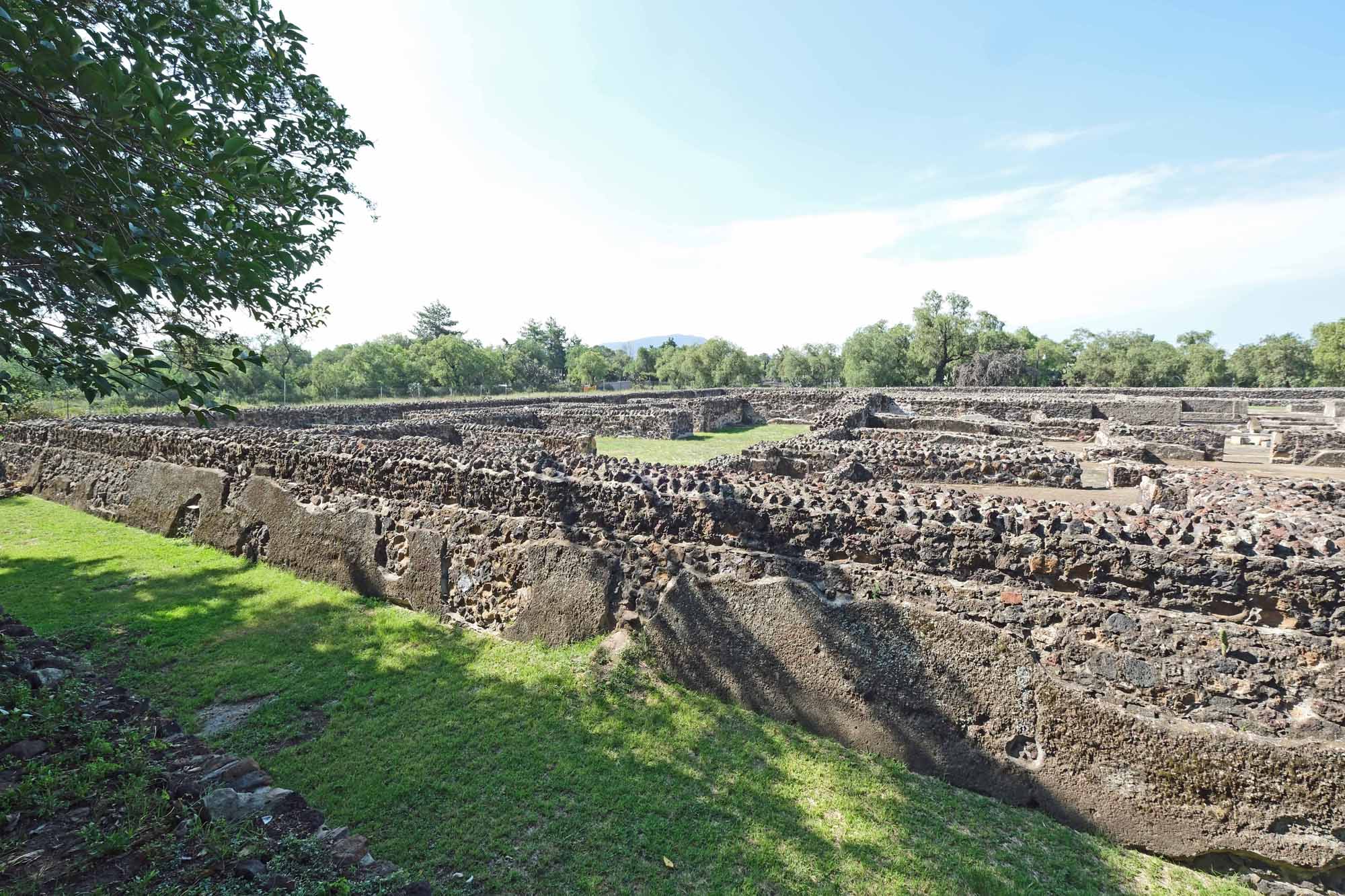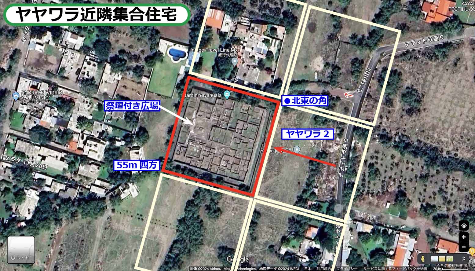 手前の荒地にはYayahuara2という地名がついています。ヤヤワラ近隣集合住宅全体は、衛星写真に付した四角い配置だったのでしょうか。テオティワカンでは多くの場合、西面がその複合構造体の正面となります。ですから、赤い四角の西側には、別の棟はなかったとも想像されます。