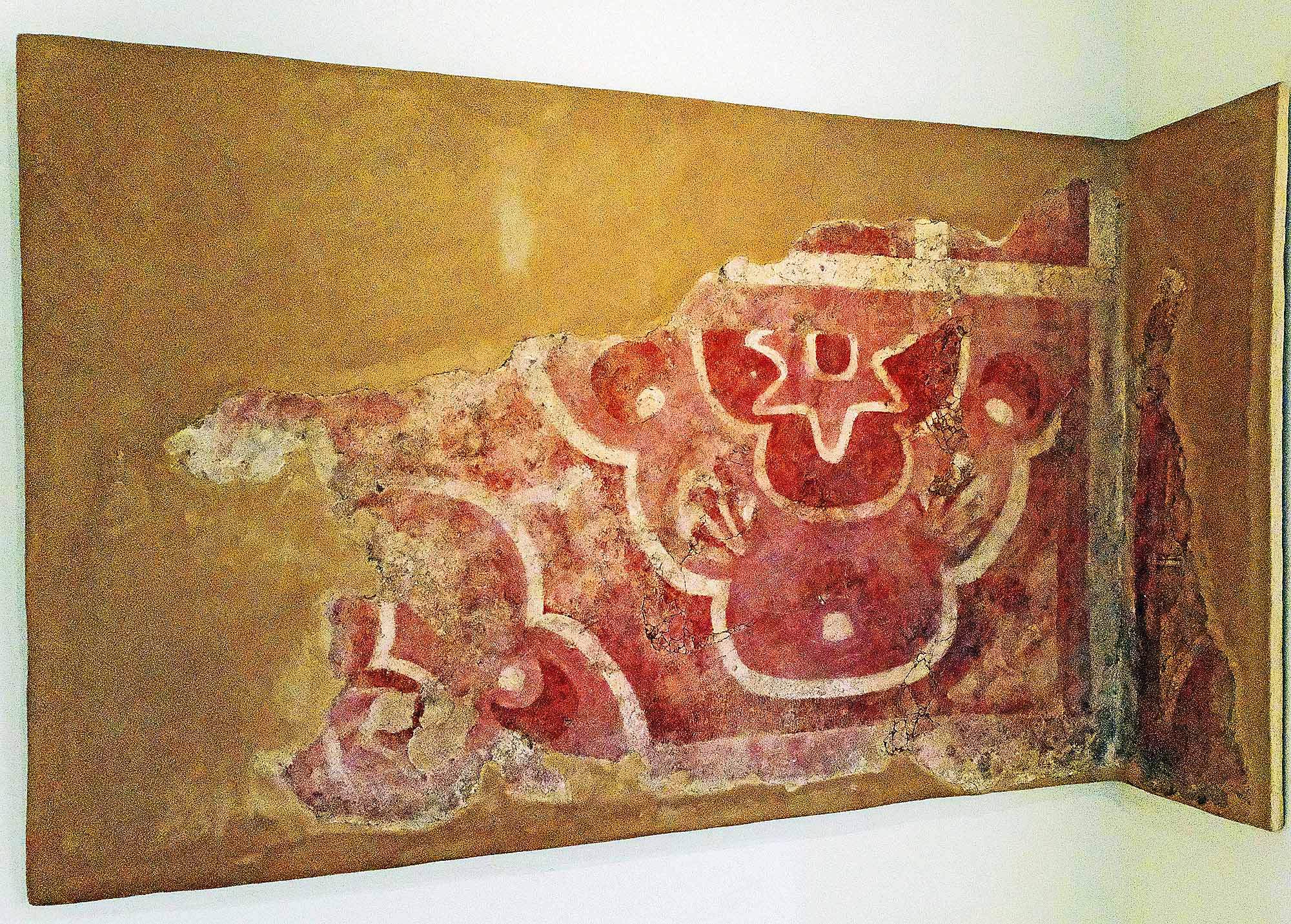 回収できた唯一の壁画です。西暦350年〜550年。右半分は、中心に星で、金星ではないようで、二重に花びらがデザインされ、二枚貝と多分巻貝が配置されています。左下はおそらく波でしょう。中庭1から出土と解説されていますので、おそらくは、一番上の写真の「祭壇付き広場」に面した壁でしょう。