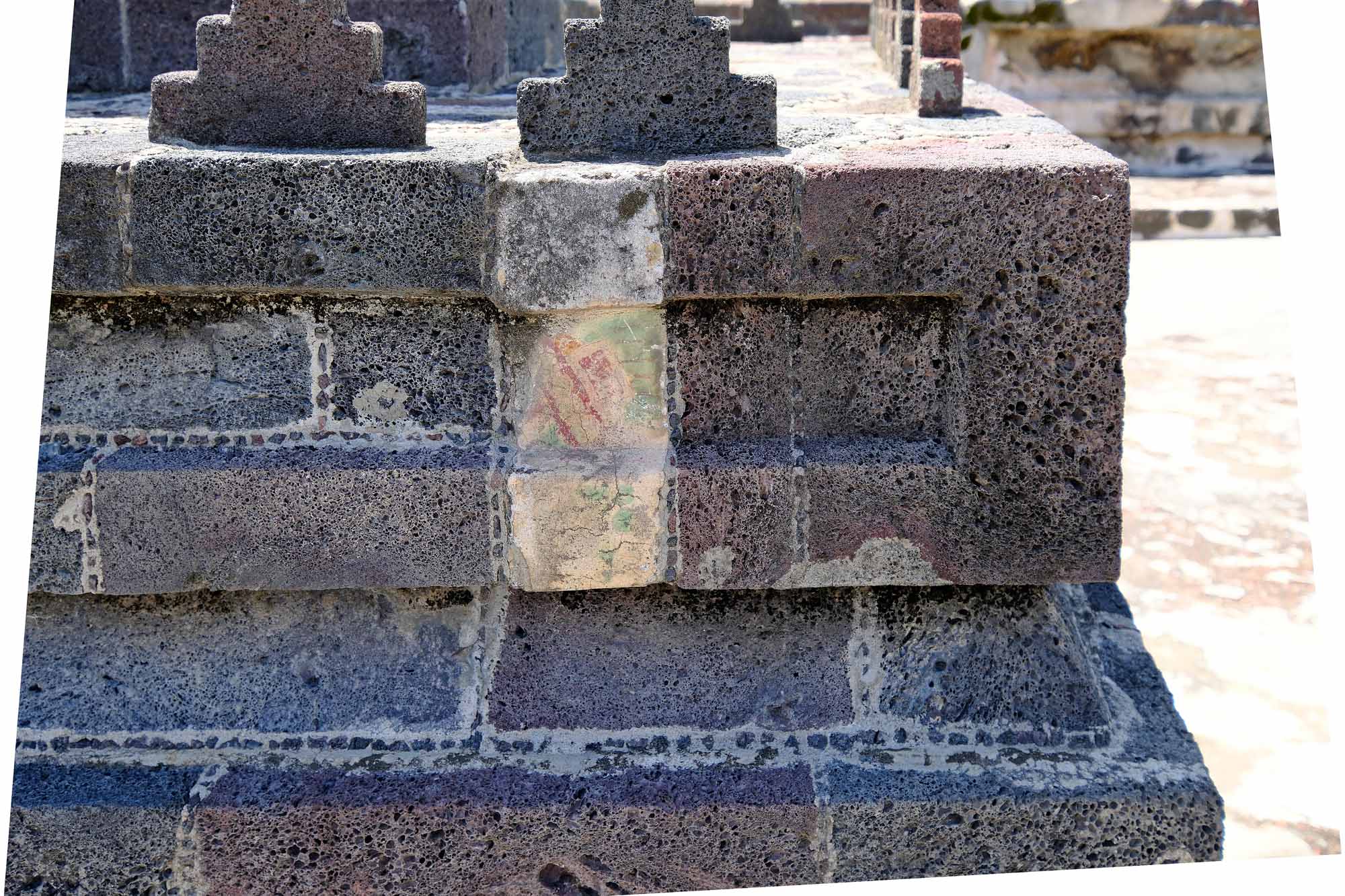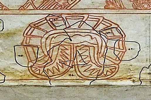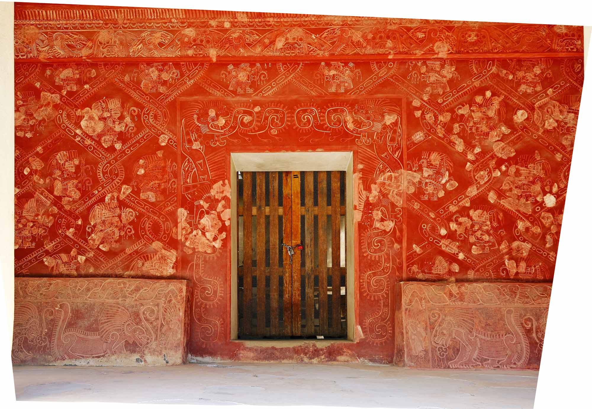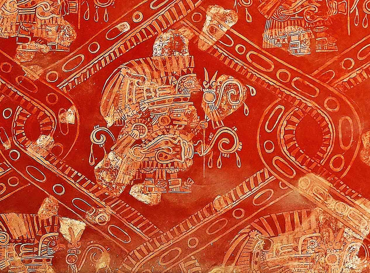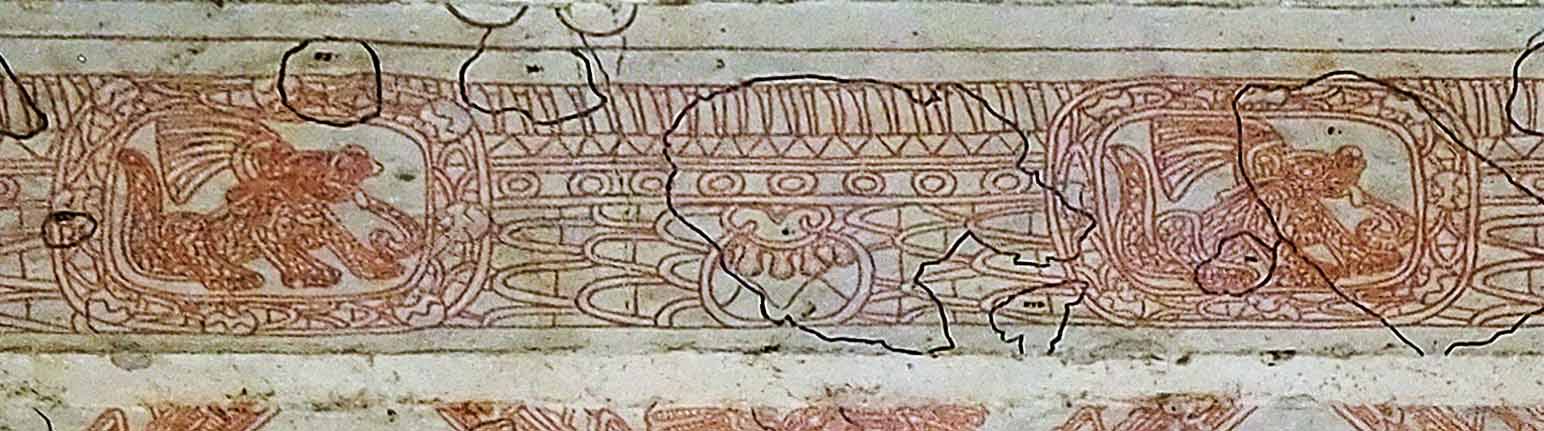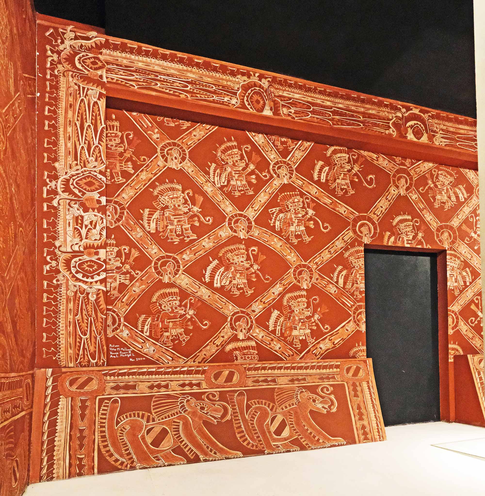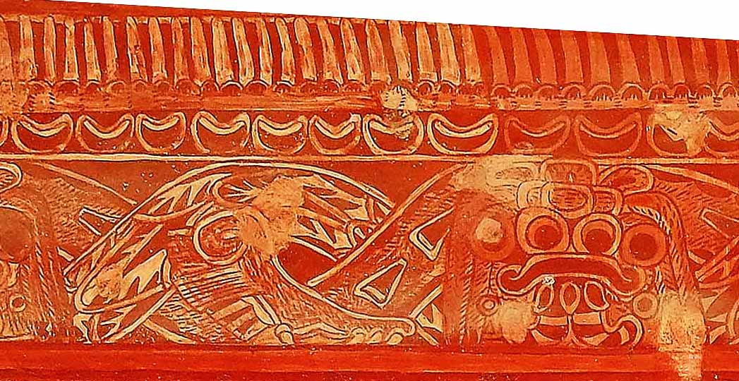 壁外枠に、コヨーテがいます。間の意匠は上から、羽毛、真直な蛇の胴、〔トラロック神〕の象徴の太丸、滴る5本の血、その両脇は黒曜石のナイフです。