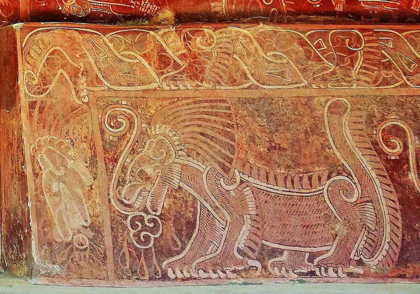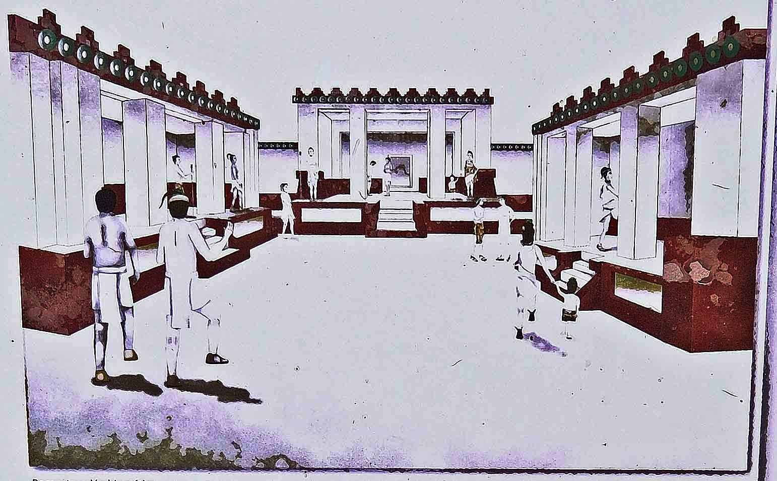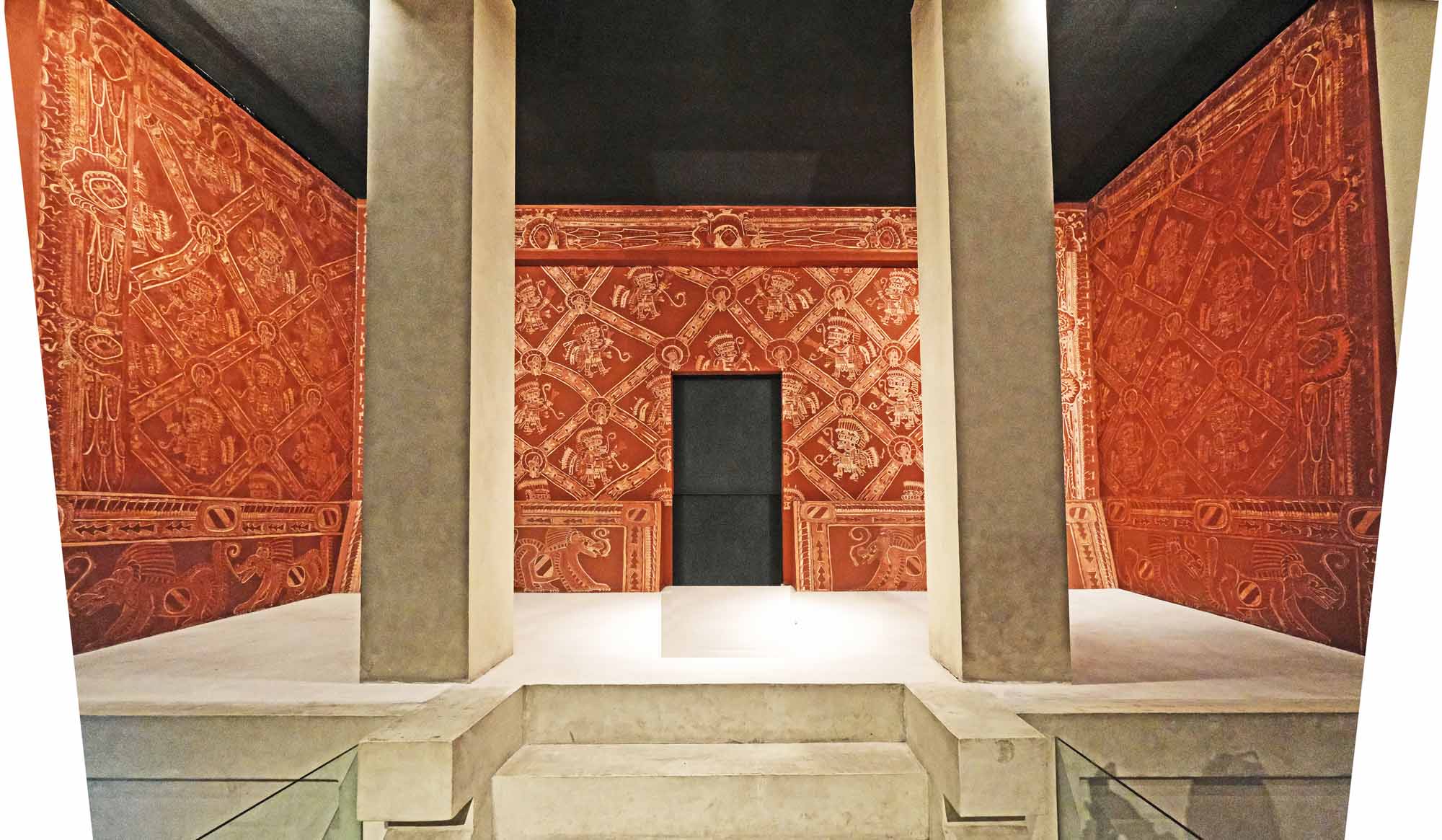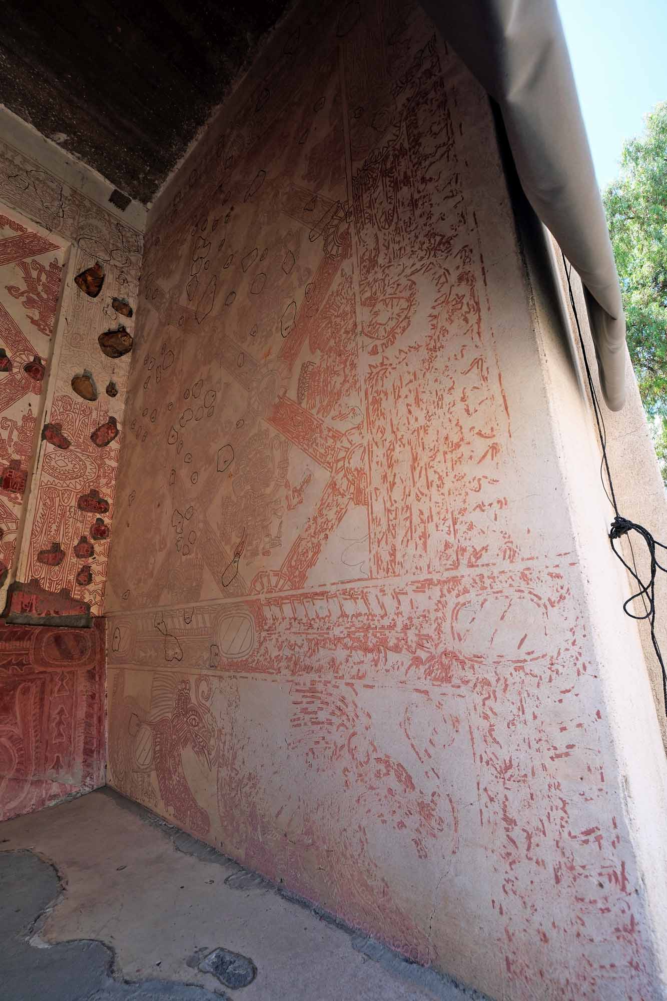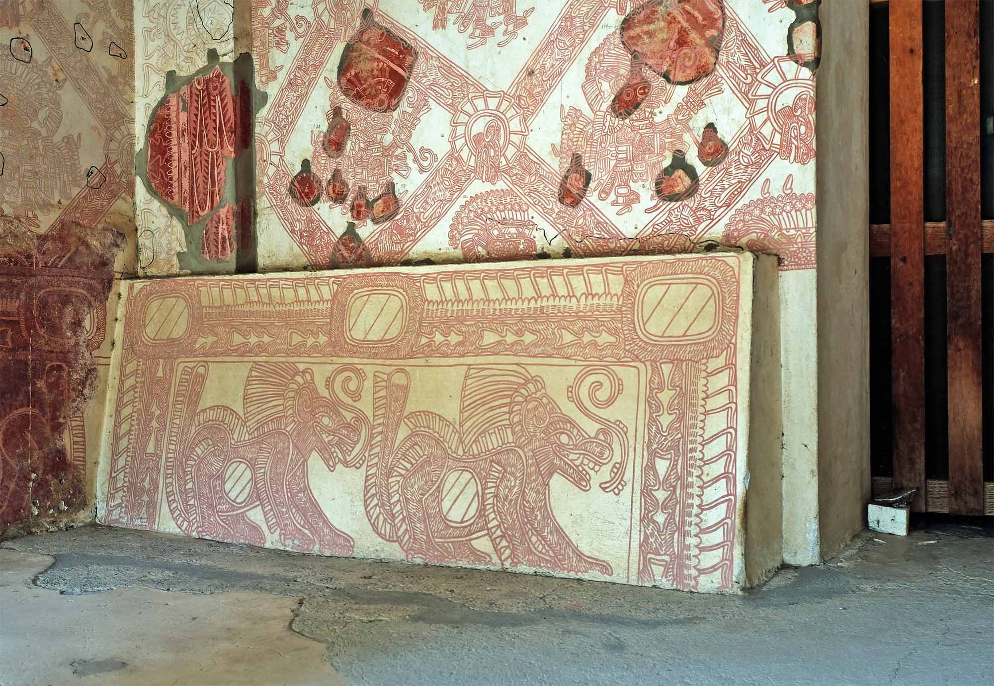 〔白い中庭〕は3つの列柱室が独自のデザインで、描き分けられています。中央に司祭、左右に、コヨーテ戦士団とイーグル戦士団が控える、という構図の可能性があります。