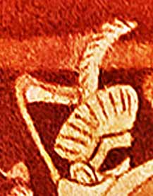 珍しく、人間です。司祭でしょう。頭飾りは鳥です。右腰に抱えた法螺貝が、2度吠えしています。