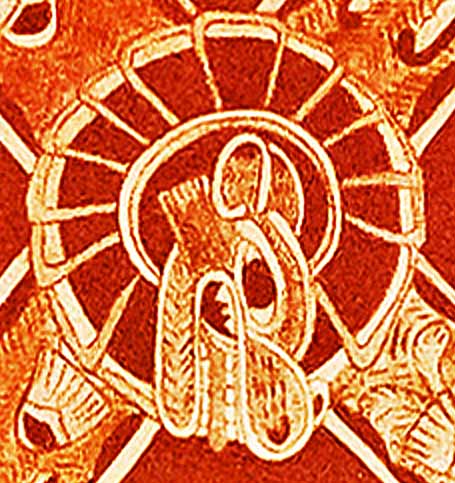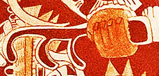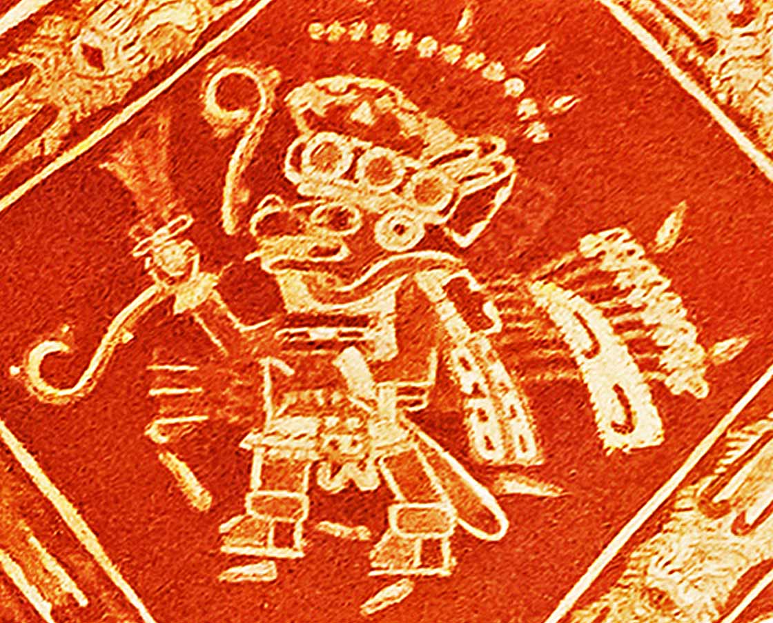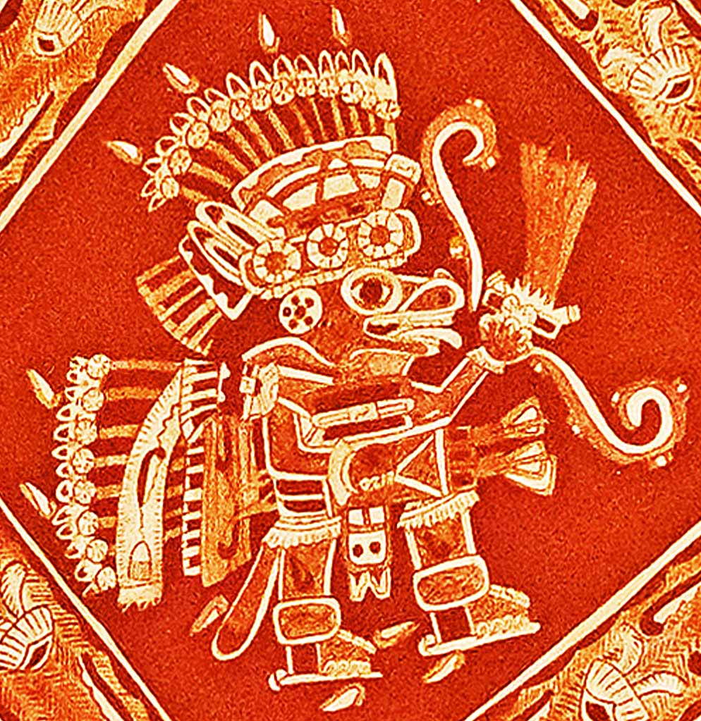 外枠で絡み合う蛇の胴体に黒曜石の矢尻が流れています。顔は、〔トラロック神〕です。戸口では、蛇の胴を持つコヨーテが二度吠えしています。