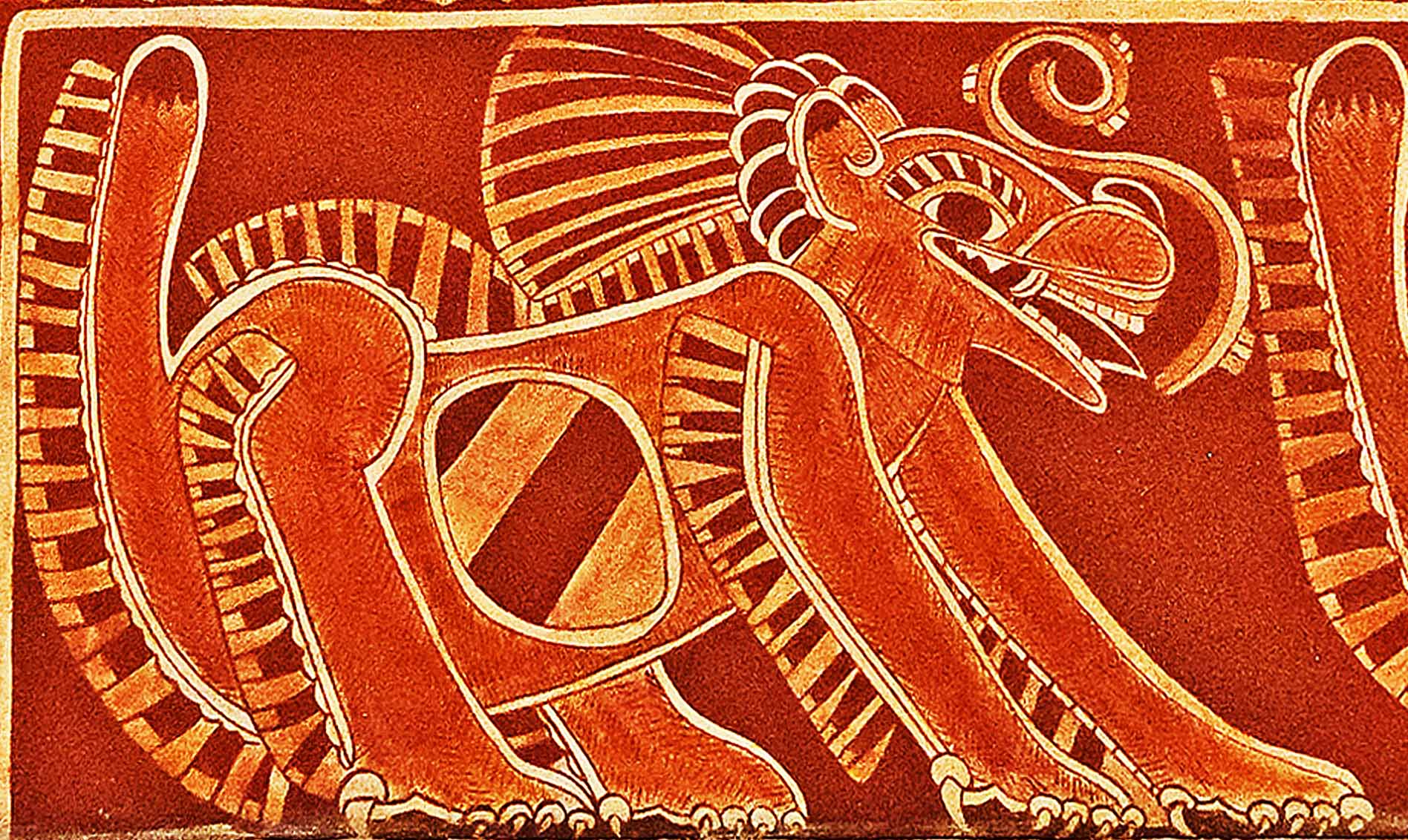 コヨーテが吠えています。胴に、壁画の縁枠にあるのと同じマークがあります。