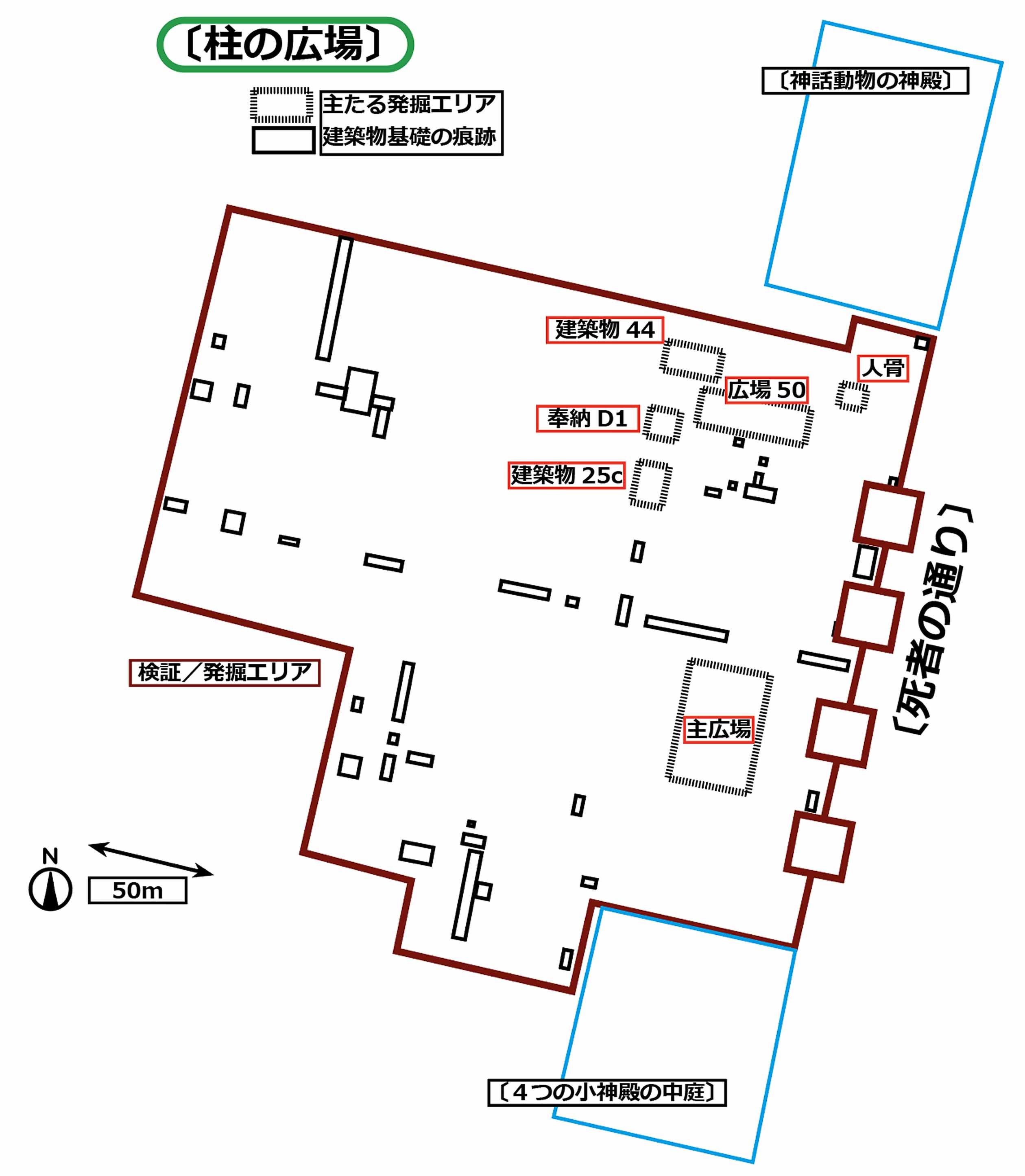 茶色のエリアの250×300mが、調査対象です。波線で囲まれた6ケ所が重点的に発掘されています。他はまだ地表観測のみで、実線で表示された建築物の基礎の痕跡があります。朧気ですが、主広場のすぐ北に、東西の建築軸がありそうです。その中央、〔柱の広場〕のほぼ真ん中に高いマウンドがあり、もしかすると、そこに主神殿があったかもしれません。