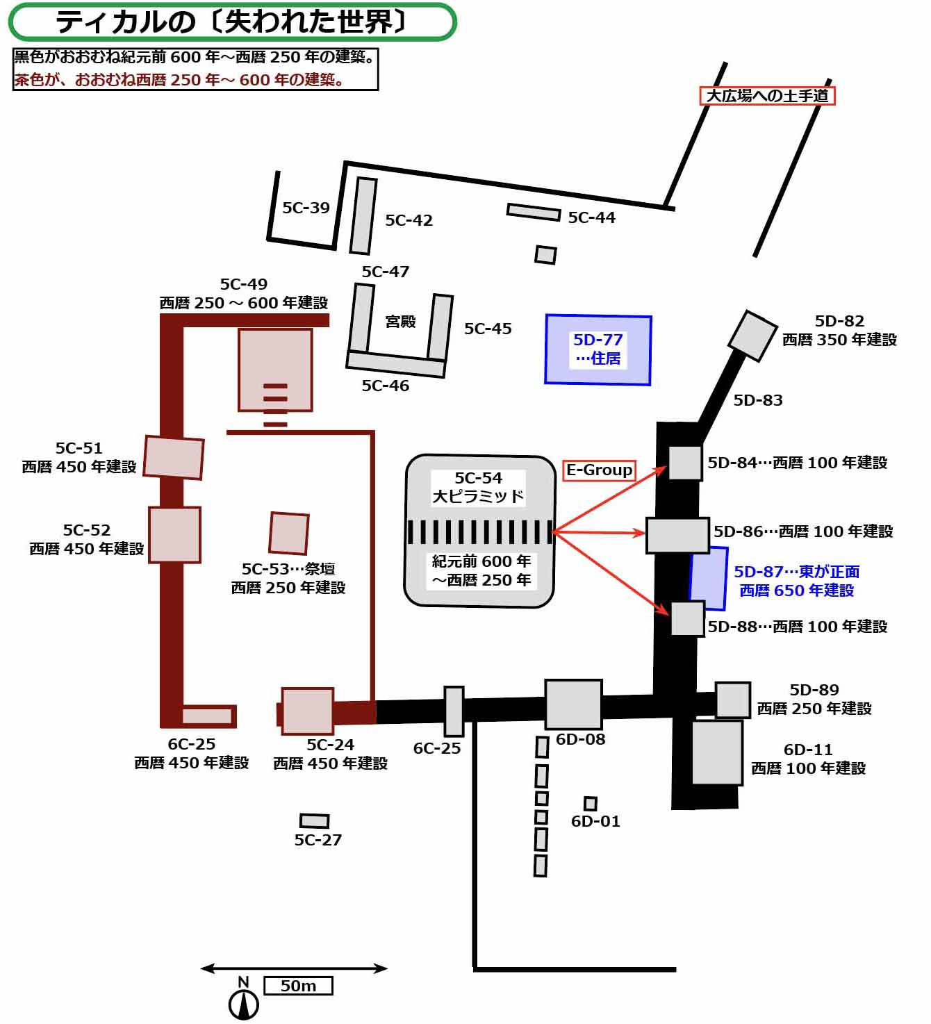 上図の黒色……紀元前600年〜西暦250年まで、〔失われた世界〕はティカルの唯一の中心地でした。5C-54は敷地の西端にあり、東側の5D-84、86、88と「E-Group」が組まれていました。