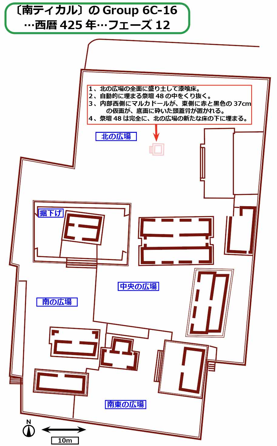 広場50……L字基壇で区切られ、主中庭より3.4m高い。5回再建され、漆喰仕上げの床。アクセス制限は高度。