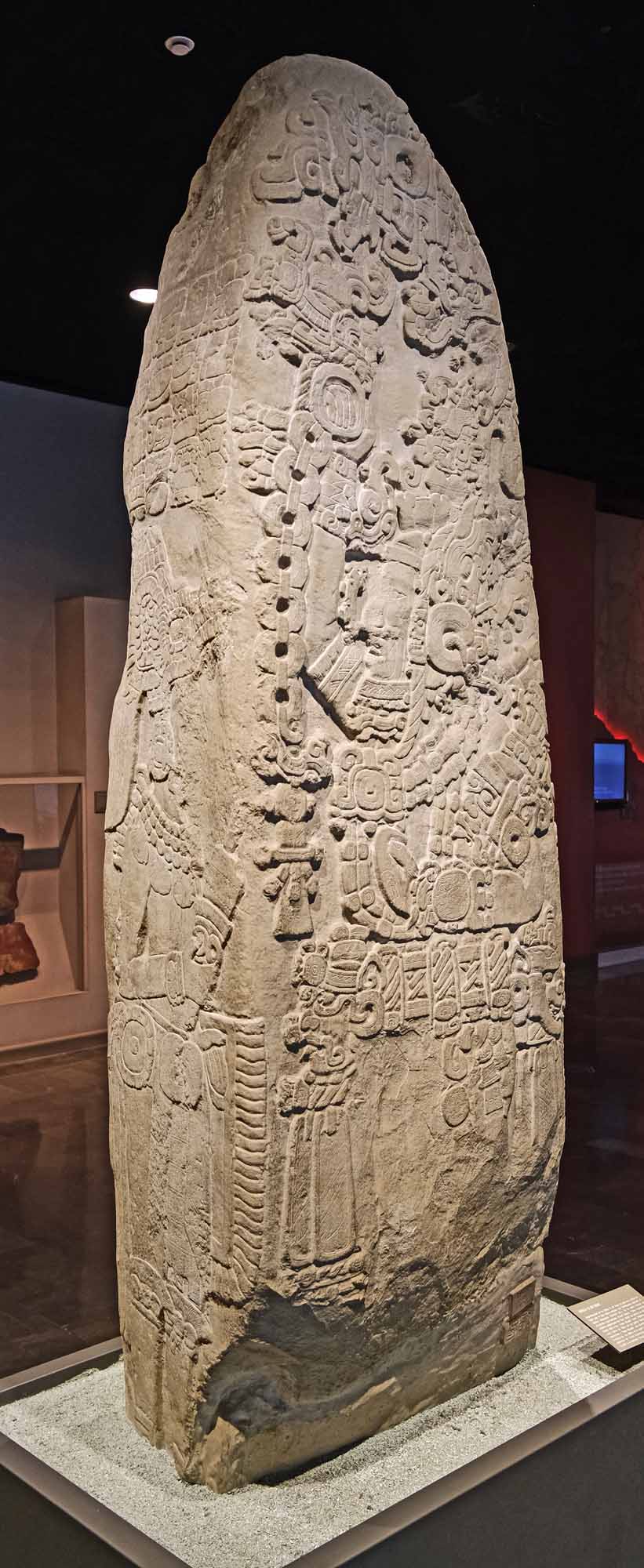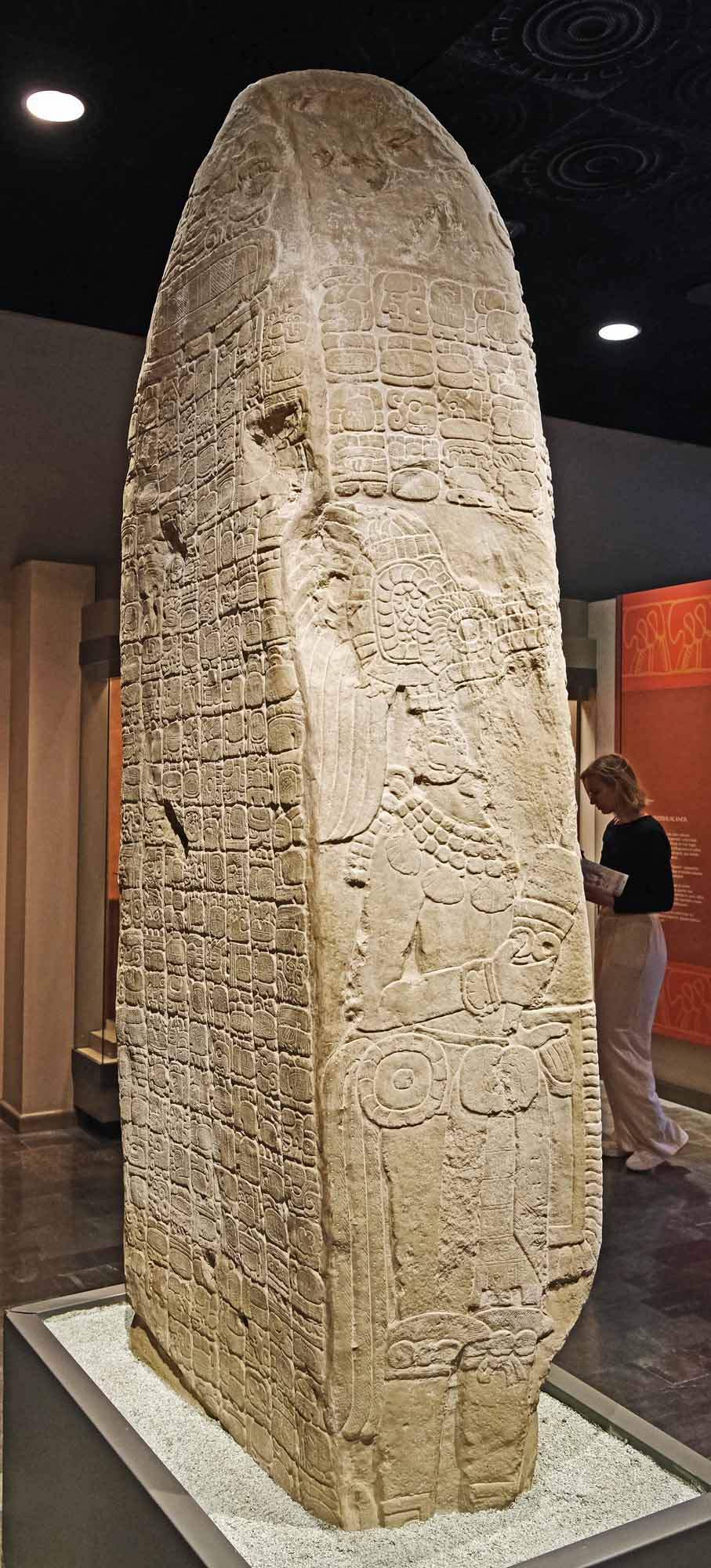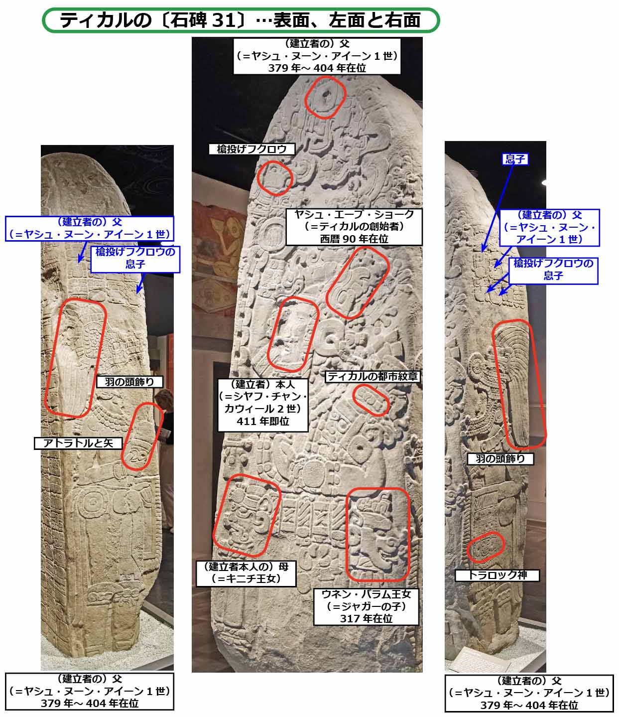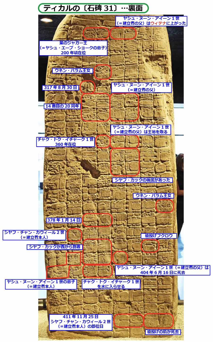 建立は西暦445年で、当時のティカル王、シャフ・チャン・ カウィール2世が、自分(マヤ衣装)と父王ヤシュ・ヌーン・アイーン1世(テオティワカン衣装)の姿を刻ませました。左右面の上部と裏面全部に彫り込まれたマヤ文字は、以下の時系列の出来事を記しています。