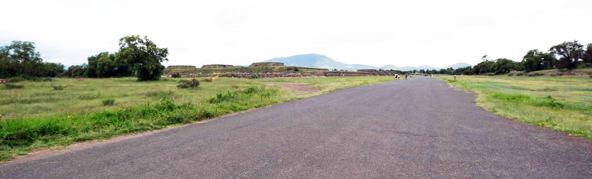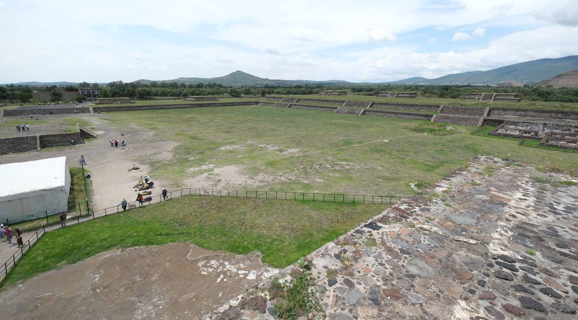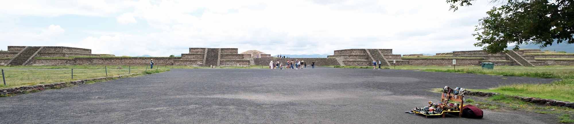 ↓西の基壇の外側です。中央に、中央階段があります。その手前に〔死者の通り〕が横切り、私は下がって、入り口1を背にして写真を撮っています。
