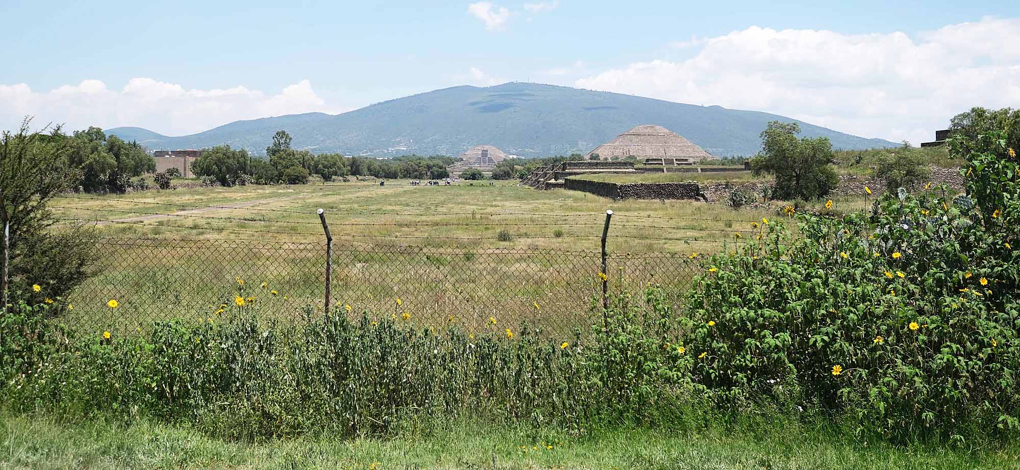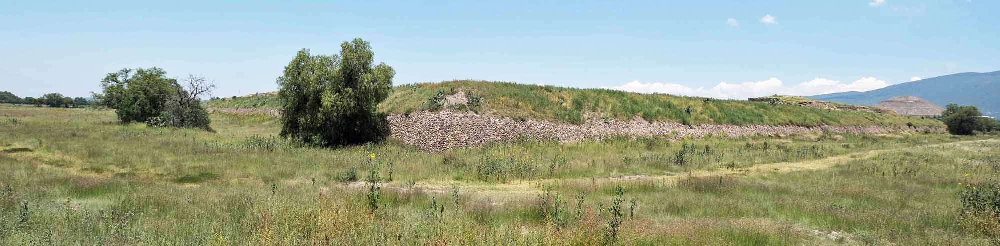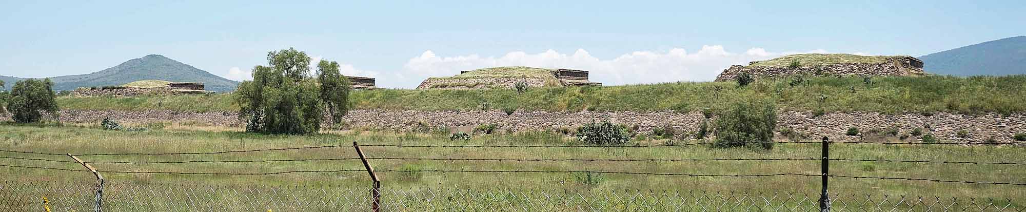 さらに西へ向かうと、〔城砦〕の南西の角があります。写真正面に〔月のピラミッド〕、右上に〔太陽のピラミッド〕があります。