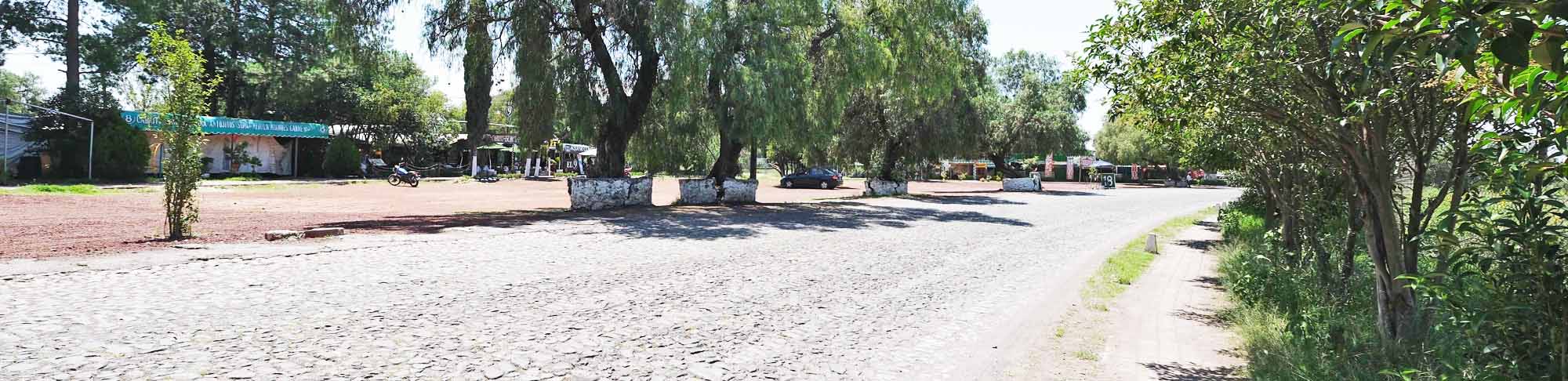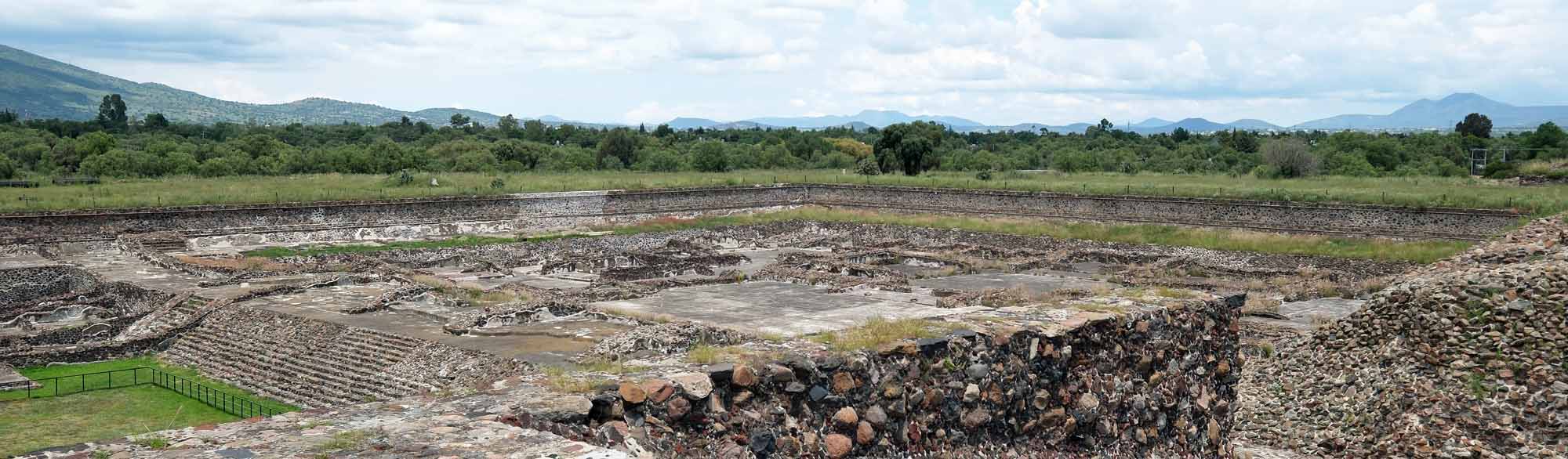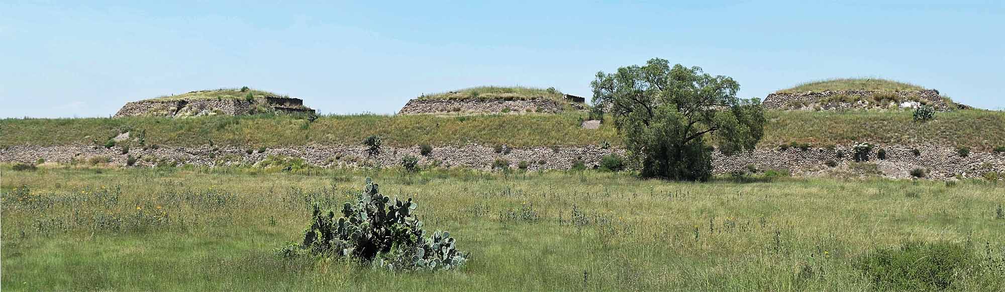 さらに西へ向かうと、〔城砦〕の南西の角があります。写真正面に〔月のピラミッド〕、右上に〔太陽のピラミッド〕があります。