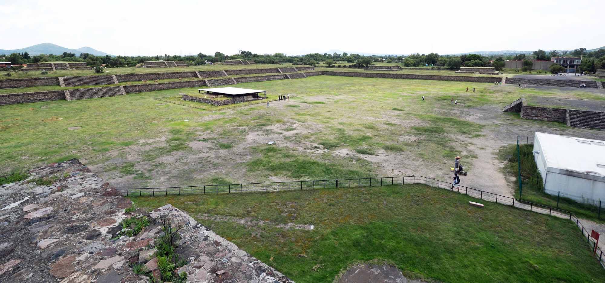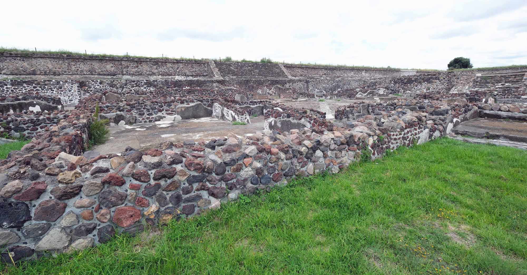 左が〔アドサダ基壇〕で、右ののっぺりしたマウンドが〔羽毛の蛇のピラミッド〕です。今、間に空間がありますが、20世紀にそれはなく、〔アドサダ基壇〕の4段のタルー・タブレロが右のマウンドに伸び、食い込み、密着していました。
