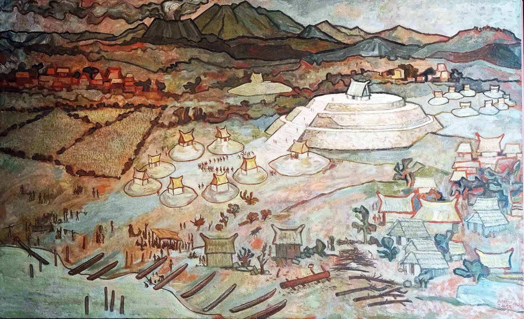 In the reconstruction, there is a circular pyramid with an altar in the center. The area is surrounded by houses with circular foundations, and seems to have been used for agriculture, fishing, and non-trade pottery manufacturing. It seems that these constituted one community, and that multiple combinations of these were connected over a wide area.