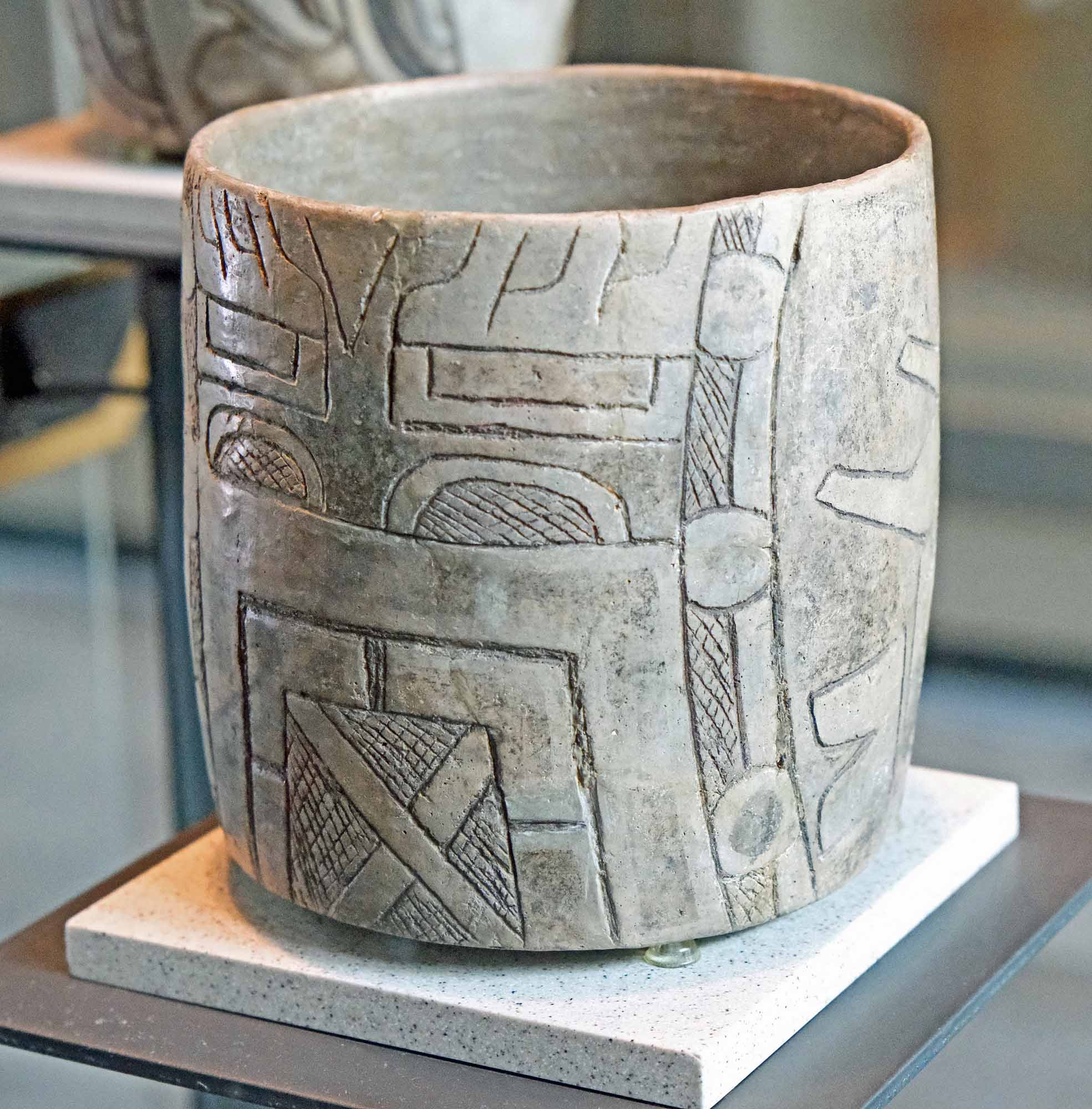 A cup with a jaguar design. The one on the right is said to be a "baby of a jaguar and a human woman," and both are Olmec-like.