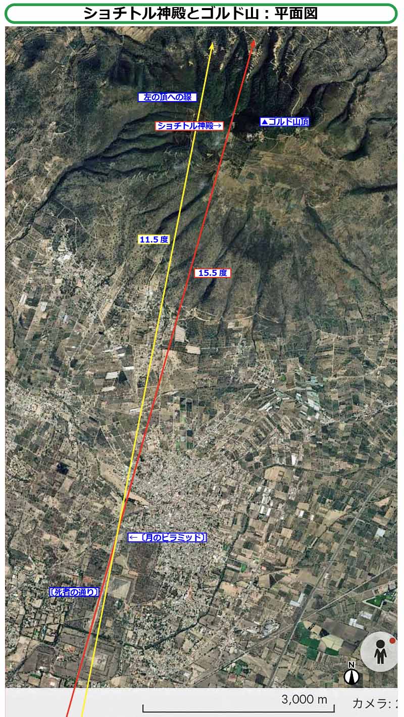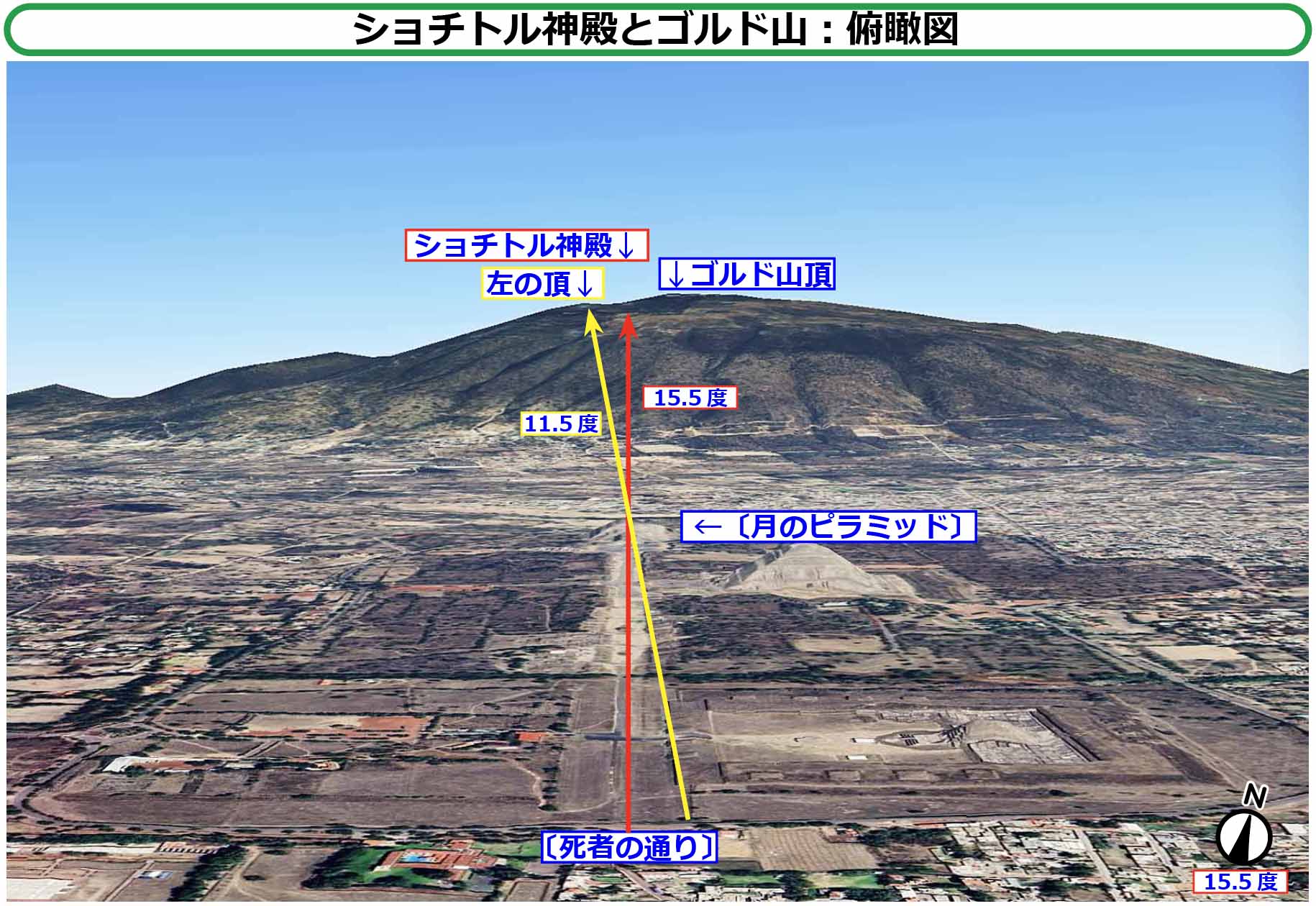 In addition, the angle clockwise from due north of [Street of the Dead] is indicated as 15.5 degrees, 15.3 degrees, 15.17 degrees, 15 degrees, etc. according to literature. The numbers vary. This site uses 15.5 degrees.