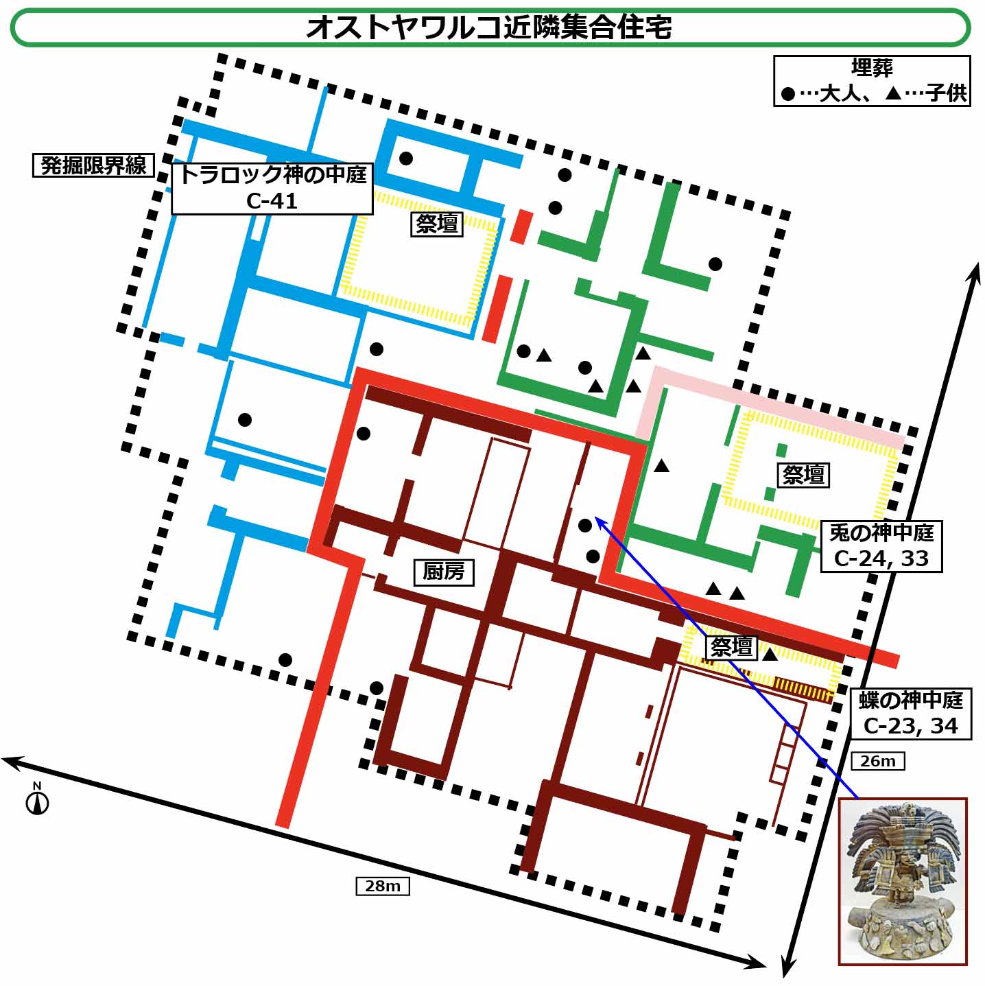The three family areas each contain living quarters, kitchen, courtyard, altar and burial, and are likely to be able to live independently. Near each altar, a statue of the god Tlaloc was found in the light blue family, a rabbit statue in the green family, and a butterfly statue in the brown family. They were probably the family gods.