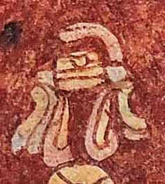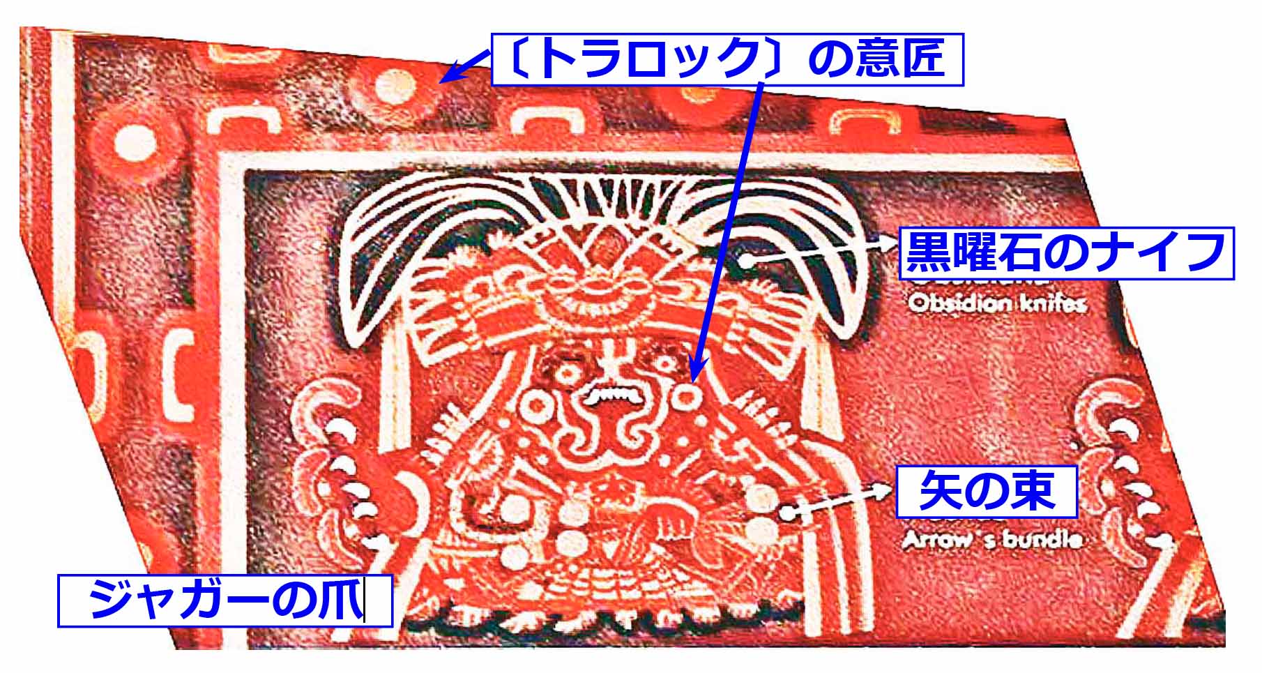 Here are my notes on the tourist sign: He is facing forward, so he is a god. Incidentally, the profile shows a human priest/warrior. He is holding the [Tlaloc design], a jaguar claw, and a bundle of arrows, so he is a warrior god.