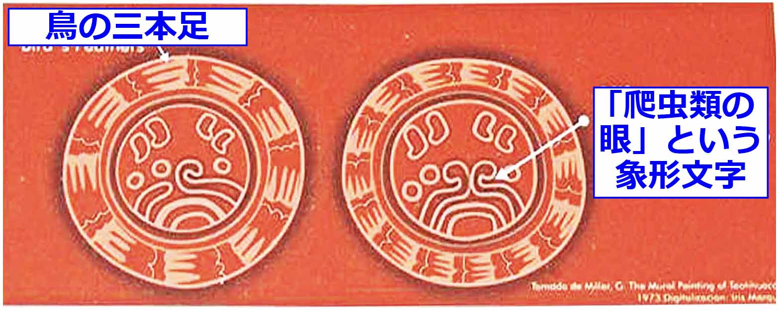 The round shield belongs to a warrior. The explanatory sign says that it is a hieroglyph representing "reptilian eyes." Is the reptile a snake? If so, does it mean "a combination of bird and snake? Also, the direction of the bird's legs and the hieroglyph are different on the left and right.