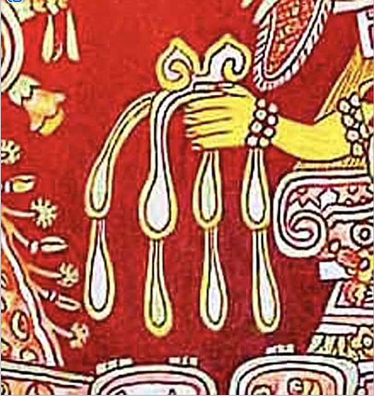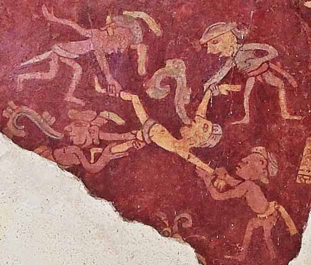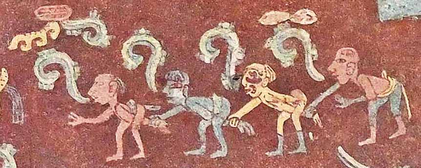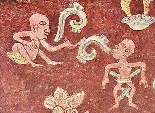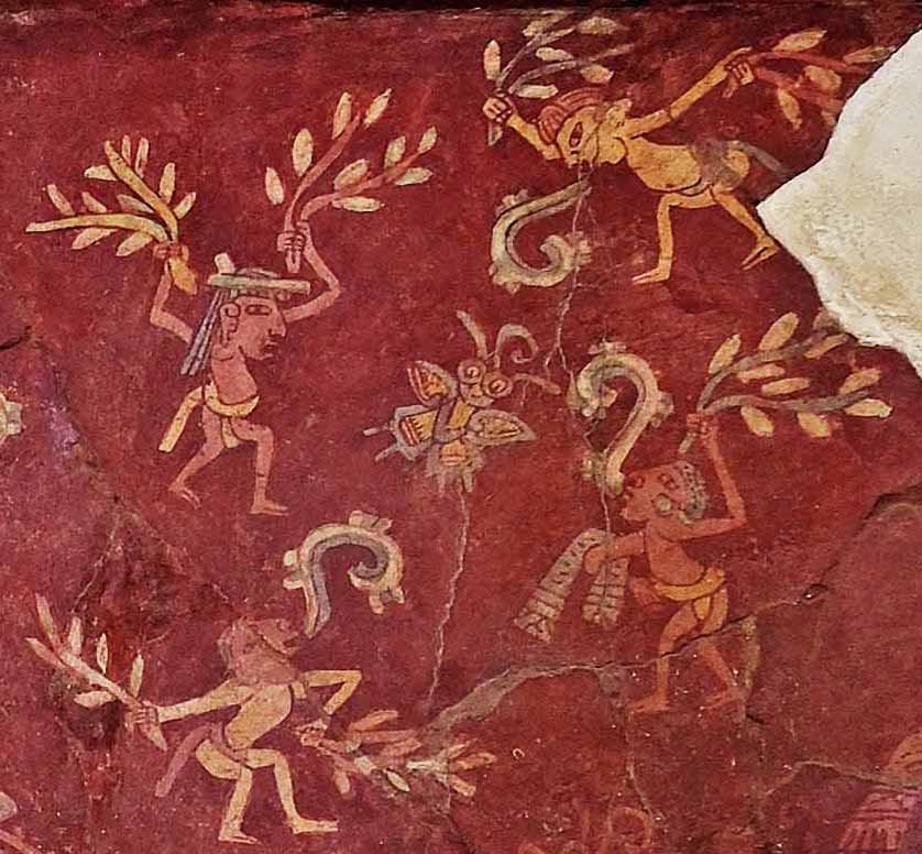 Water and blood are represented by the same type of drop. Humans offer their lifeblood to the gods, and the gods bring life-giving water to humans. The idea of self-sacrifice has existed in Mesoamerica since ancient times, and Teotihuacan seems to have been no exception.