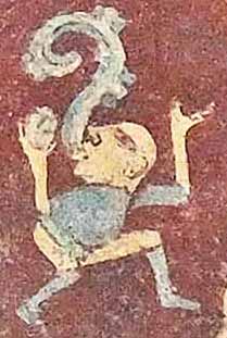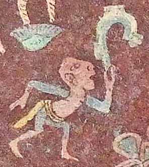 This is a close-up of the mural in the center right. The figure is carrying an incense bag, so he is a priest. He is walking to the right.