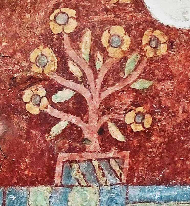 Although all the paintings are almost identical in composition, there are differences between each of them. For example, the plants hanging from the tops of the bubbles coming from the hands of the priest in the center and the priest on the right are depicted differently. If all the paintings in Room 2 had remained intact, the differences would have been obvious.
