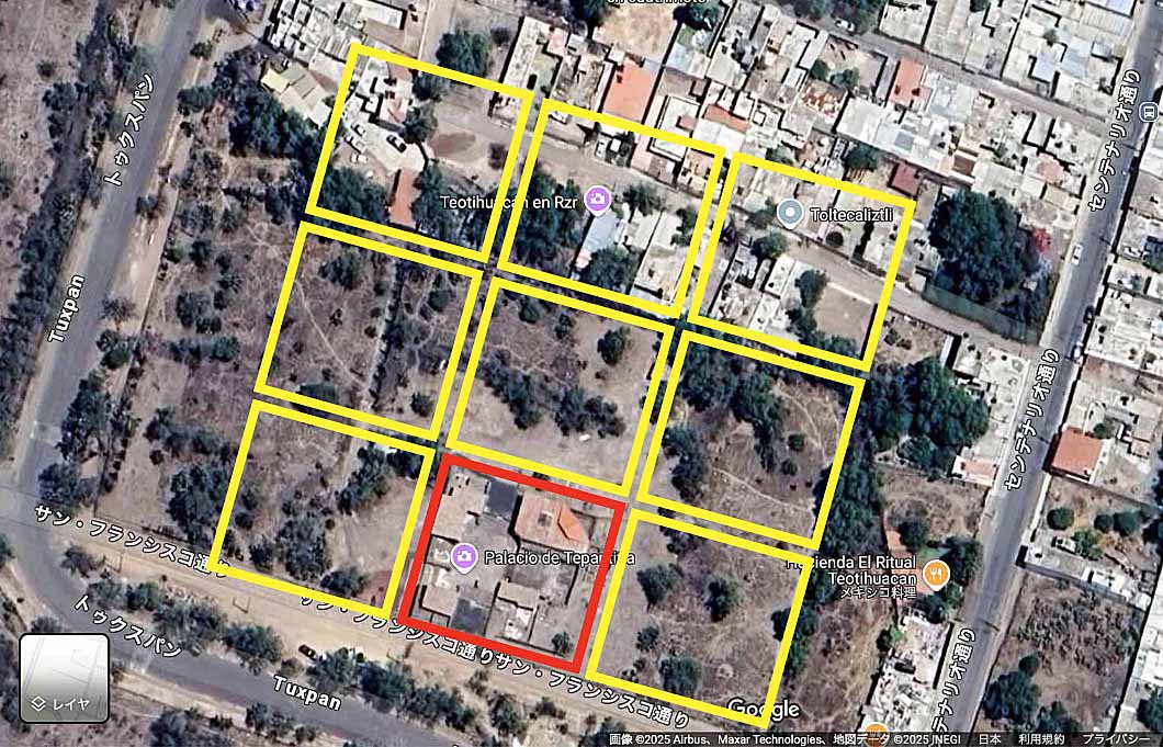 Below is a hypothetical diagram. The red square is Tepantitla, which can be visited, and the yellow is an imaginary residential building. Since the red has religious functions, it is possible that one of the yellow buildings was a workshop or a residence.