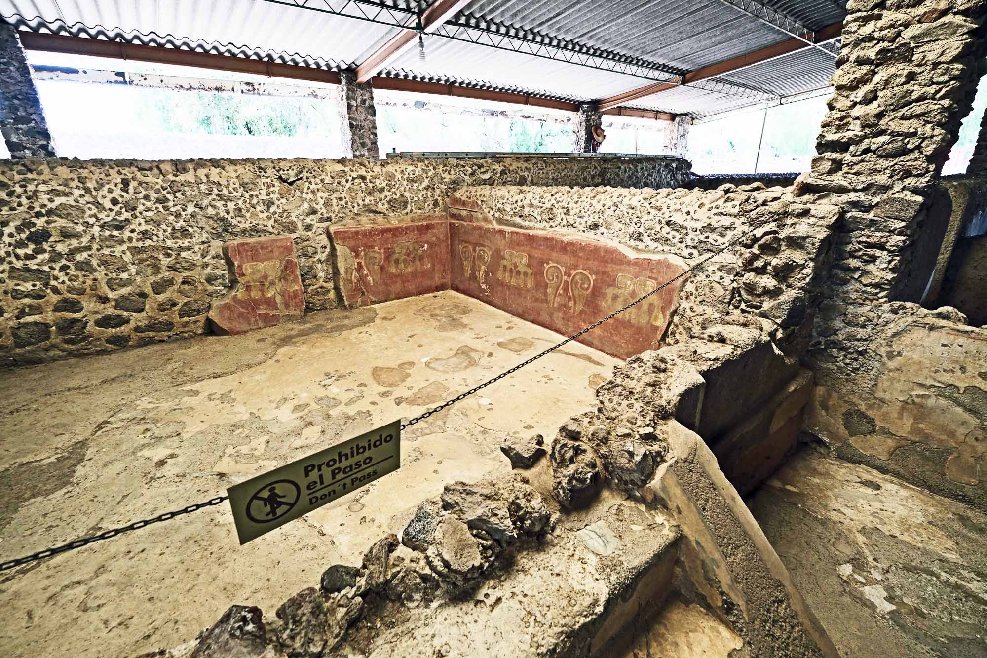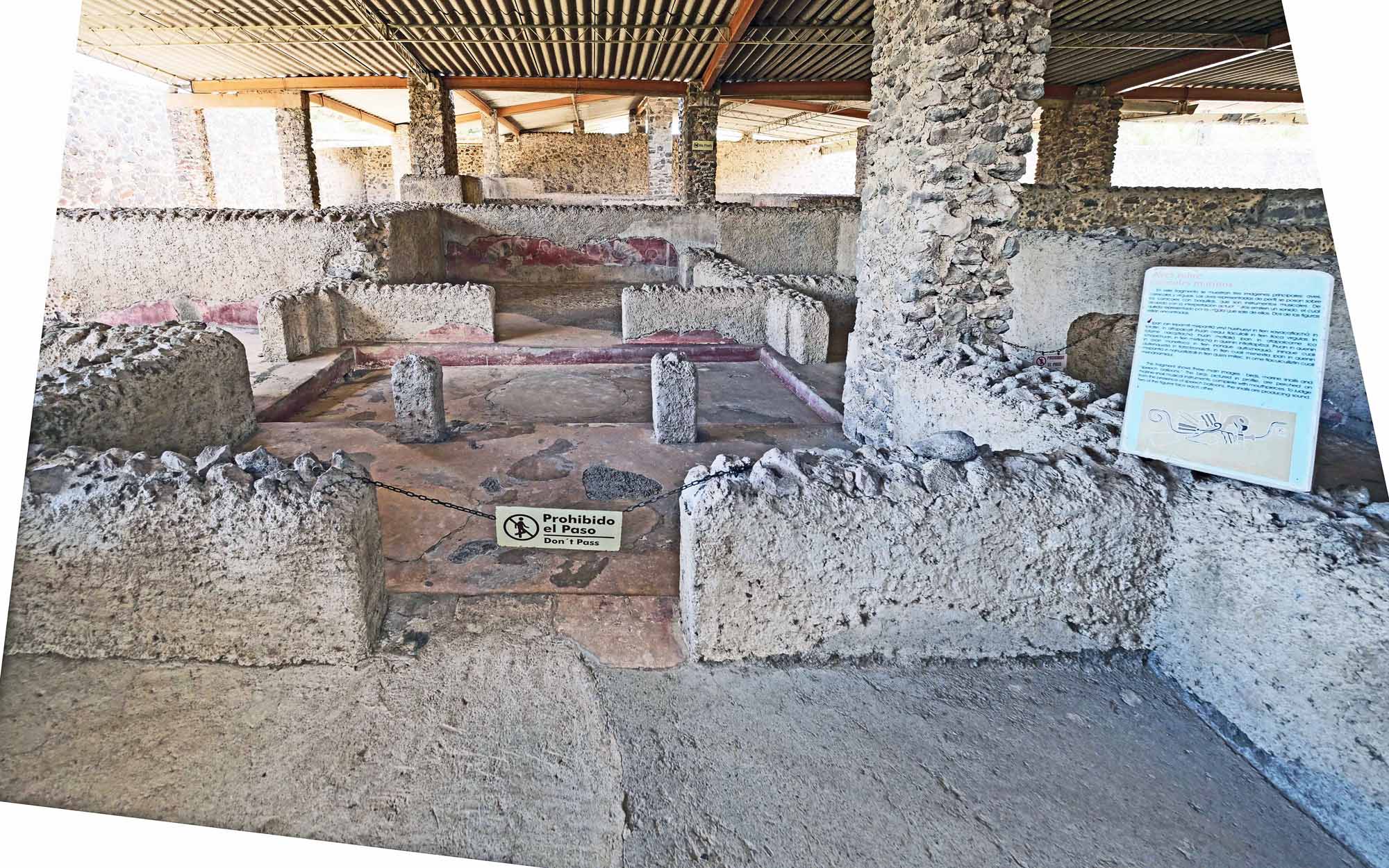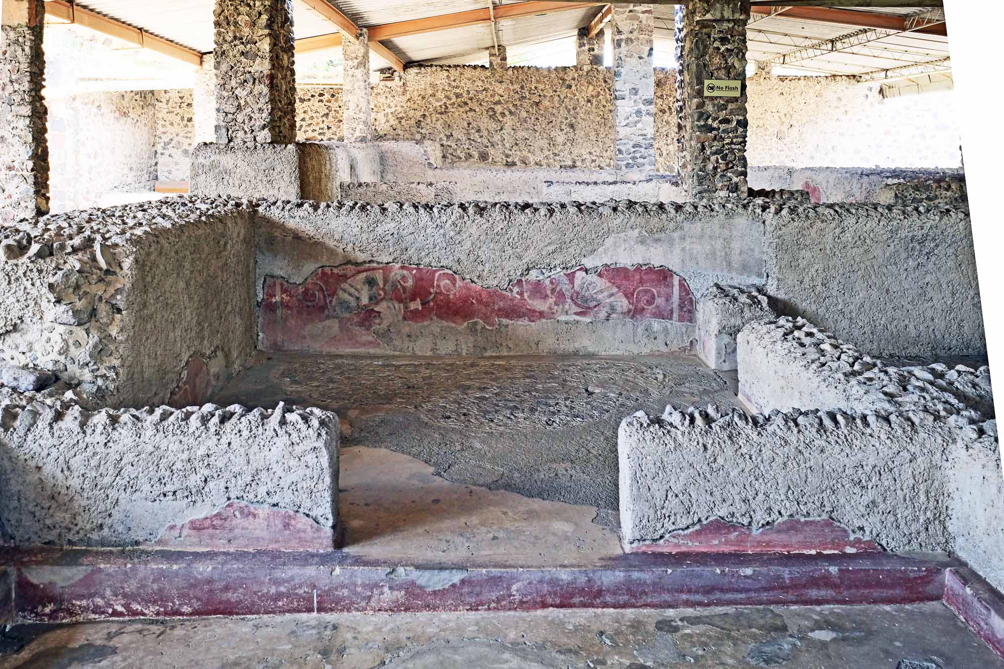 Two pillars once stood where the reinforcing pipes are now. Beyond them is a plaster floor and, further back, a green Tlaloc mural.