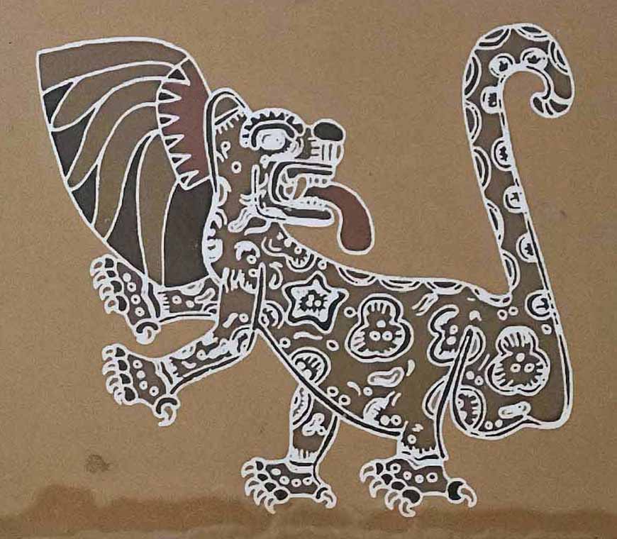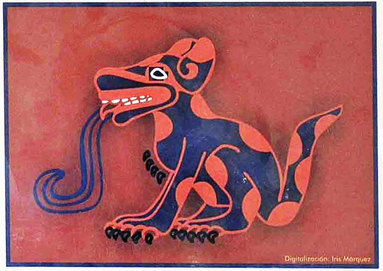 The Jaguar's spots are interspersed with Venus and other designs, and the shape of its erect tail resembles an obsidian knife.