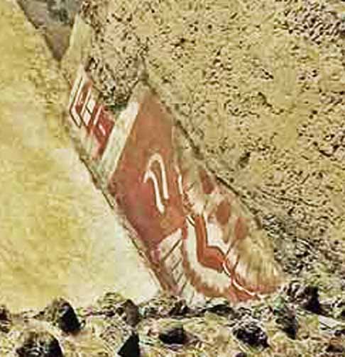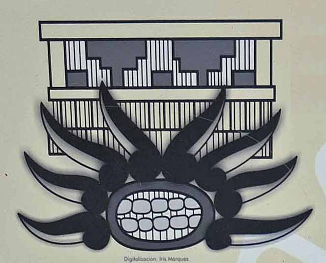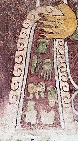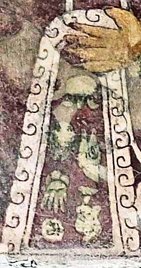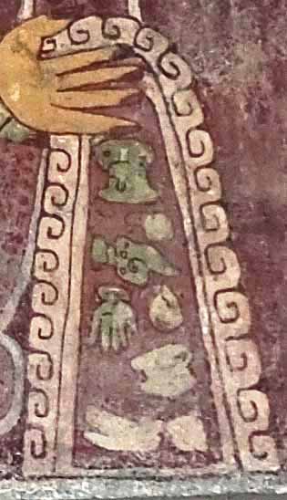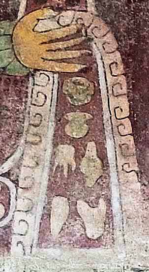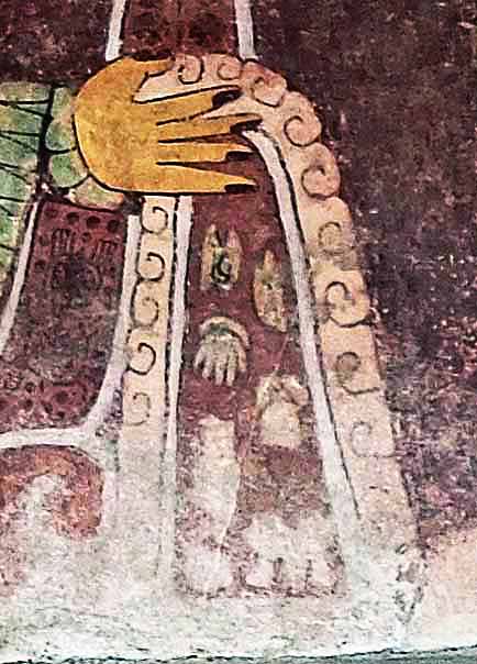 These hands are probably those that bring blood or water. Between the hands are the three mustaches/fangs commonly seen on the god Tlaloc. The hands are identical to those on the Net Jaguar mural in the Temple of the Jaguars on the right.