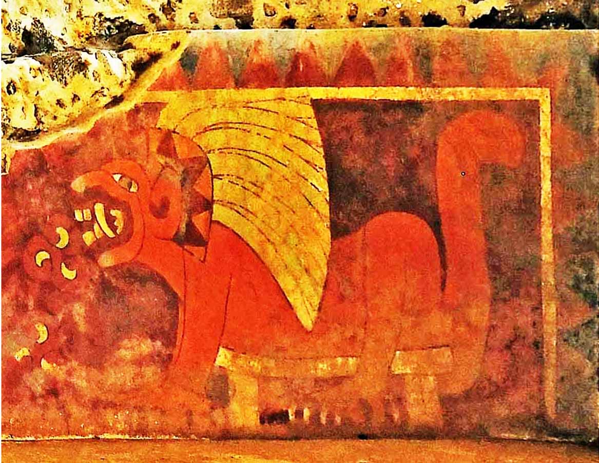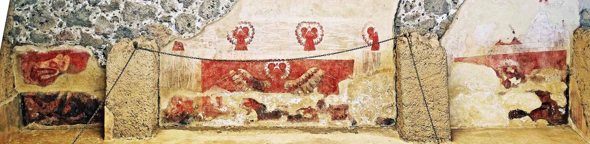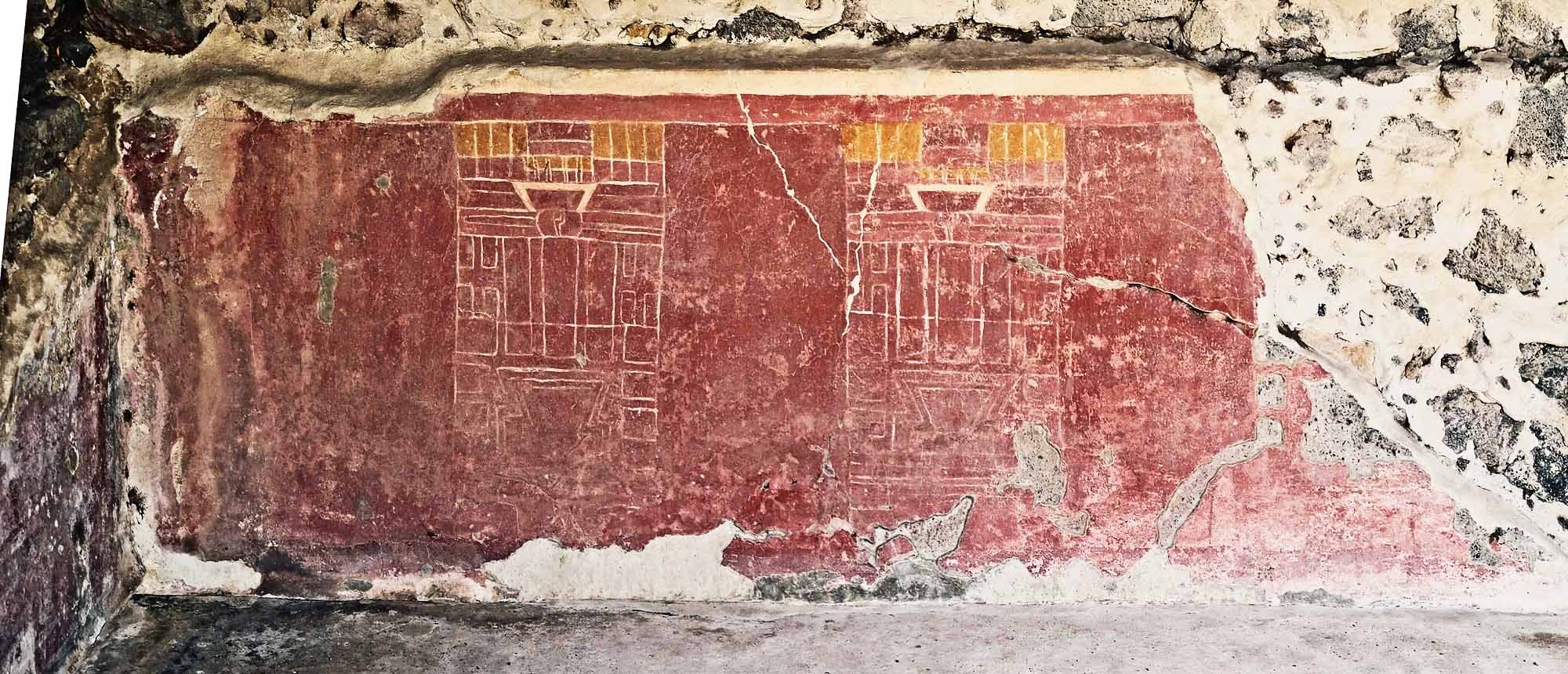 The lines that should be straight are a bit crooked. It doesn't seem to be because the plaster backing is distorted. I think this is the most crude mural in Teotihuacan.