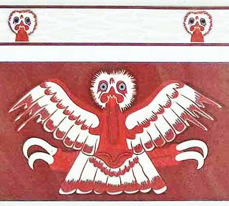 The barking dog has five toes and is depicted in profile, so it could be human. The pattern on its body could be another version of the netted jaguar. The eagle facing forward is a god.
