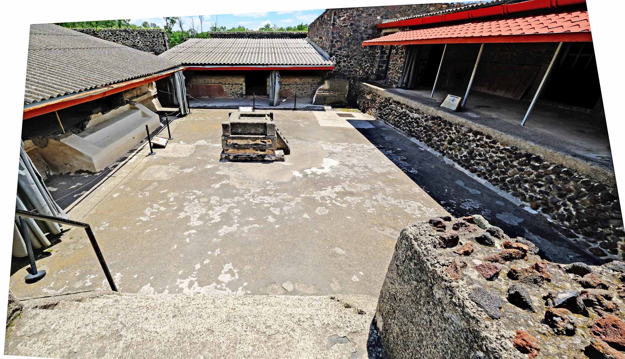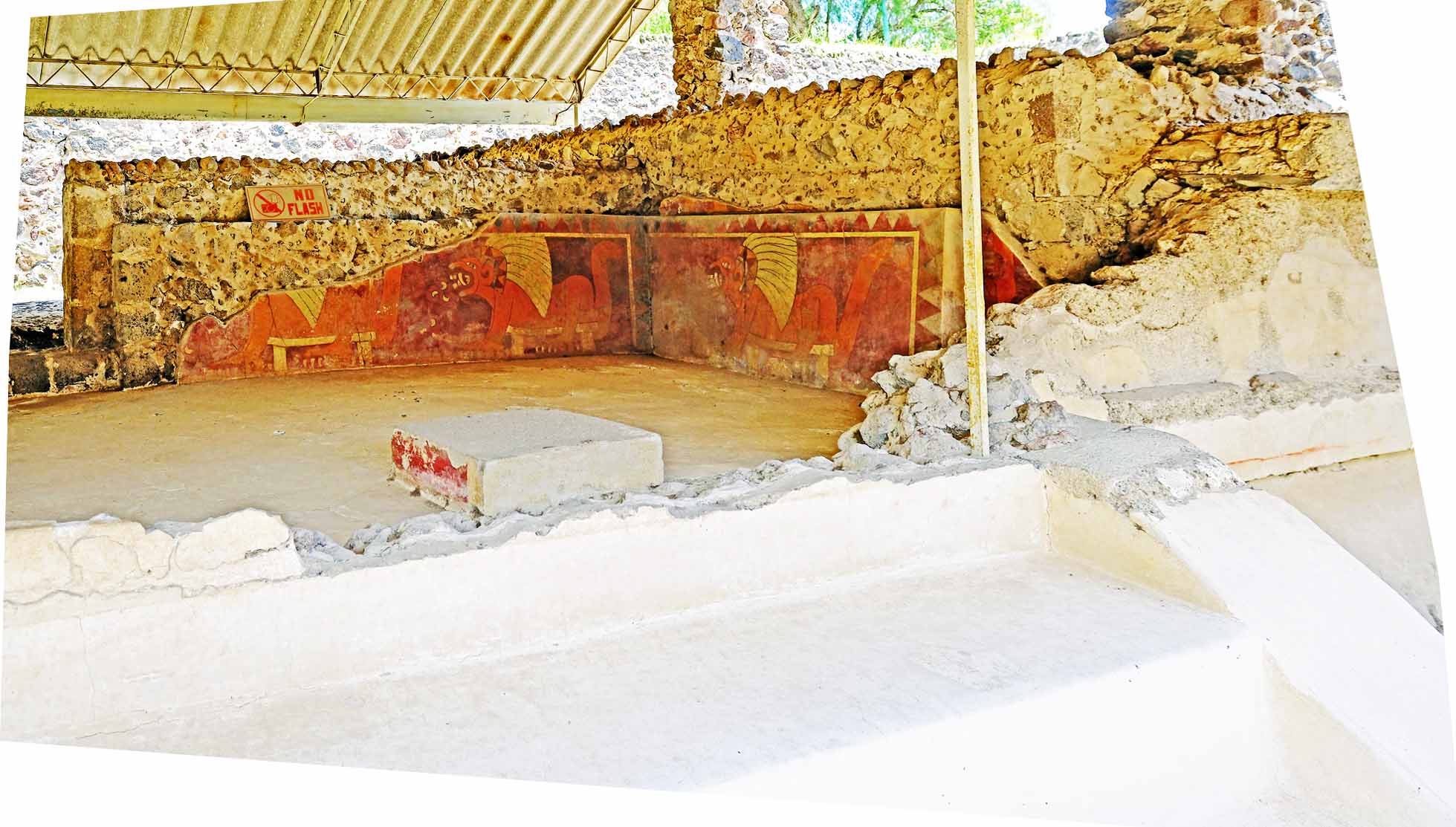 The central altar is in the tablero style, without any slope wall. There is a staircase on the west side. The murals on all four sides are different. Viewed from the north.
