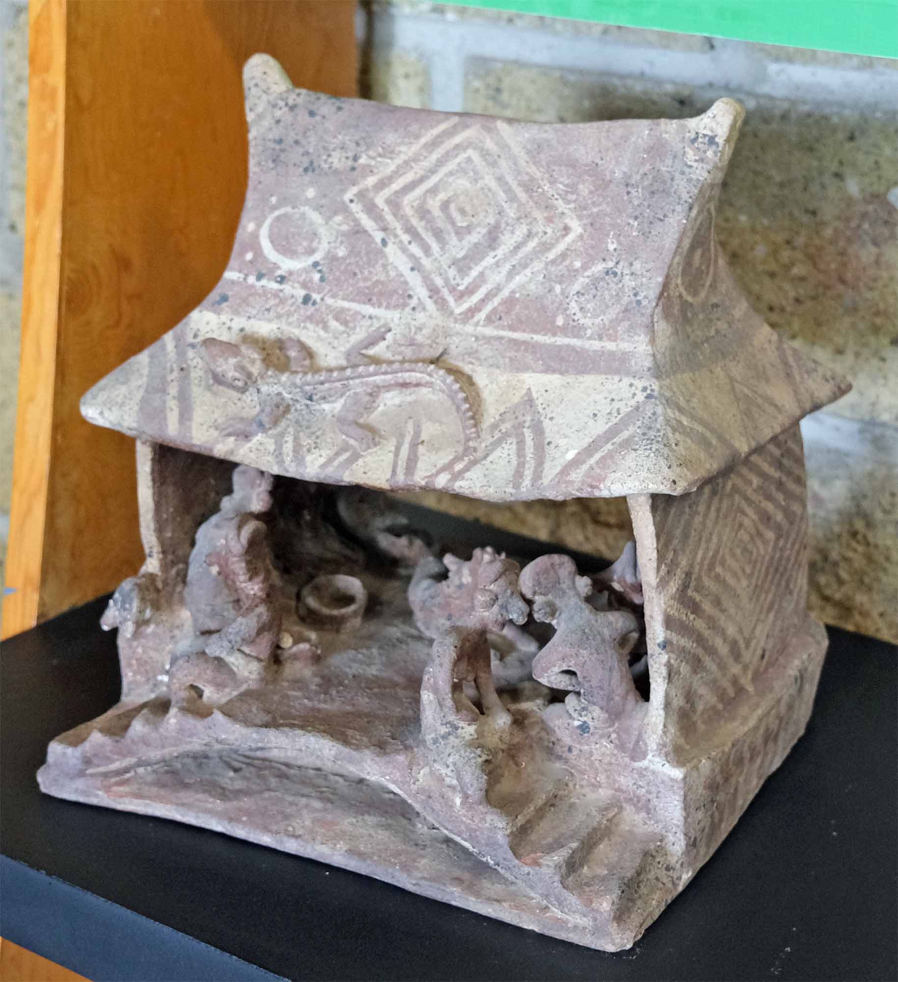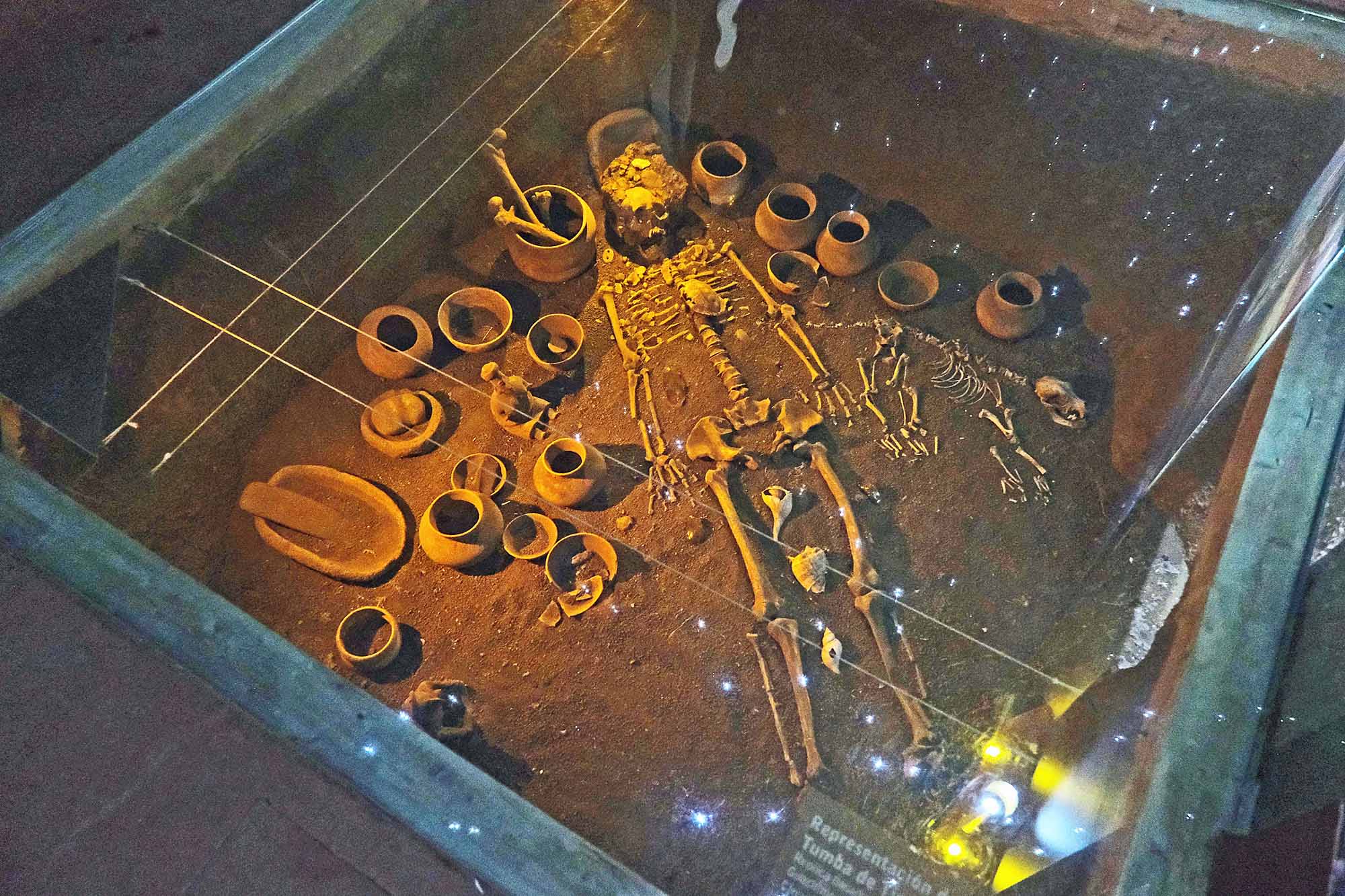 This is a reconstructed diorama of a generalized shaft tomb. Pottery, mano and metate, animal bones, figurines, and conch shells were buried. Although not shown here, many of the shaft tombs had clay works such as houses attached to them.