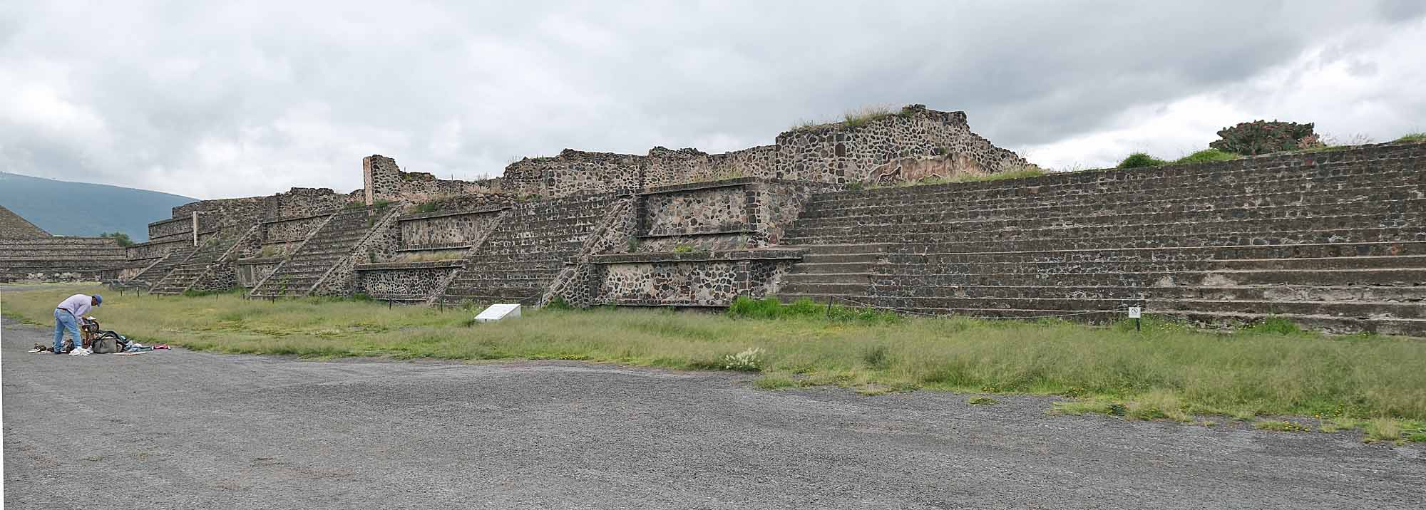 It has a wide colonnade, a thick talud tablero base, and a wide staircase. What is the back side (east side) like?