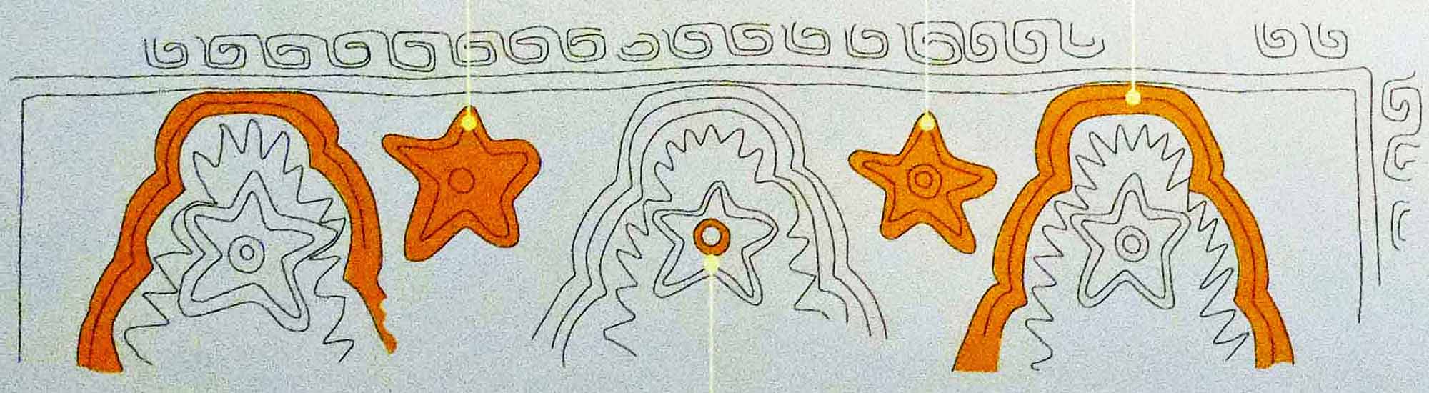 The central design is likely a bivalve shell. It is surrounded by a thin, meandering stream of water. The "back of the hand facing downwards" can also be seen. Below is another mural in the same room, with the same design as the photo above.