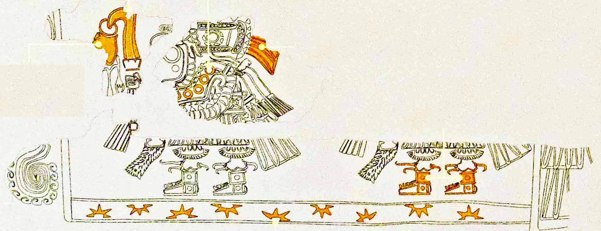 The profile of the figure's face is not well preserved, but the three claws on the top of the sandals suggest that it is a priest who has transformed into a bird. The obsidian knife he is holding has what appears to be a heart at the tip, dripping with blood.